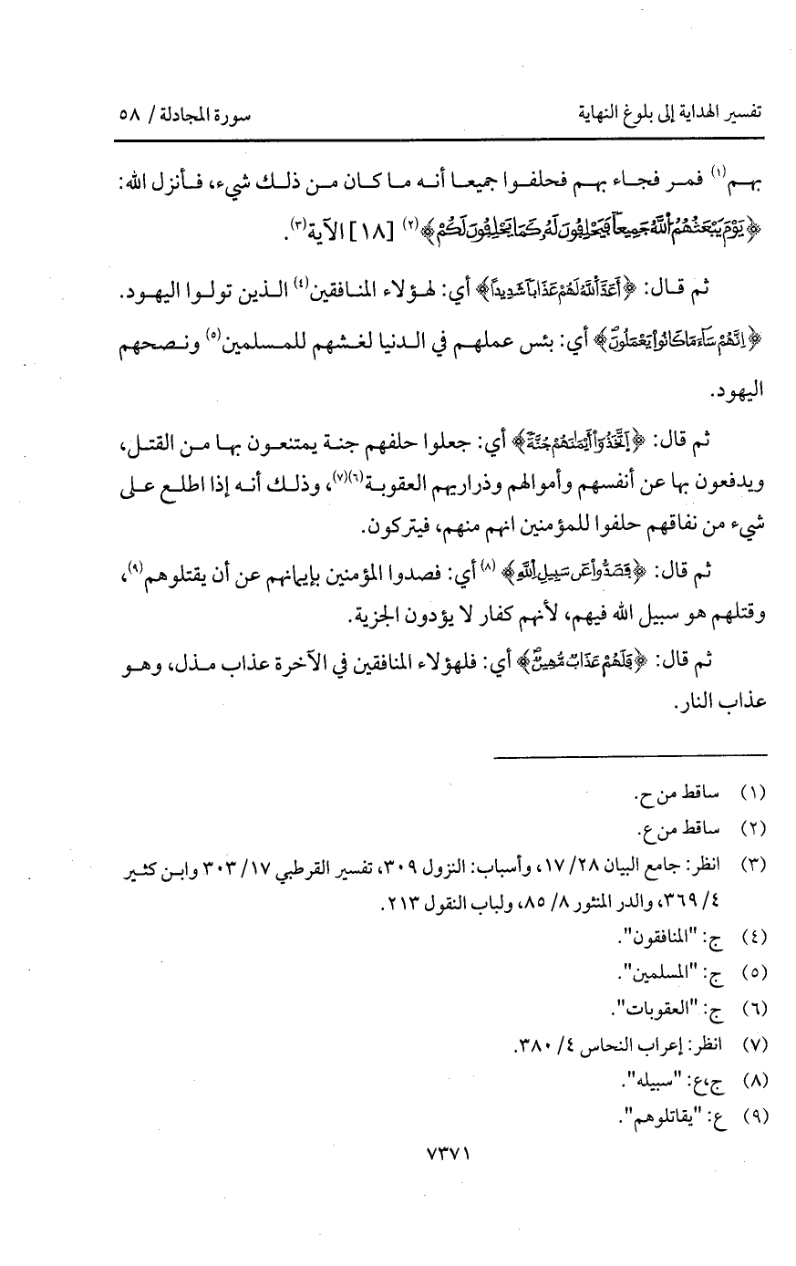 بهم فمر فجاء بهم فحلفوا جميعا أنه ما كان من ذلك شيء، فأنزل الله: {يَوْمَ يَبْعَثُهُمُ الله جَمِيعاً فَيَحْلِفُونَ لَهُ كَمَا يَحْلِفُونَ لَكُمْ} الآية ".
