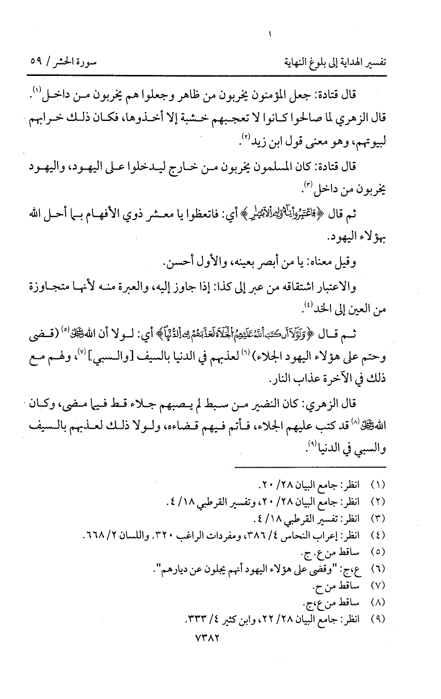 قال الزهري: كان النضير من سبط لم يصبهم جلاء قط فيما مضى، وكان الله D قد كتب عليهم الجلاء، فأتم فيهم قضاءه، ولولا ذلك لعذبهم بالسيف والسبي في الدنيا.