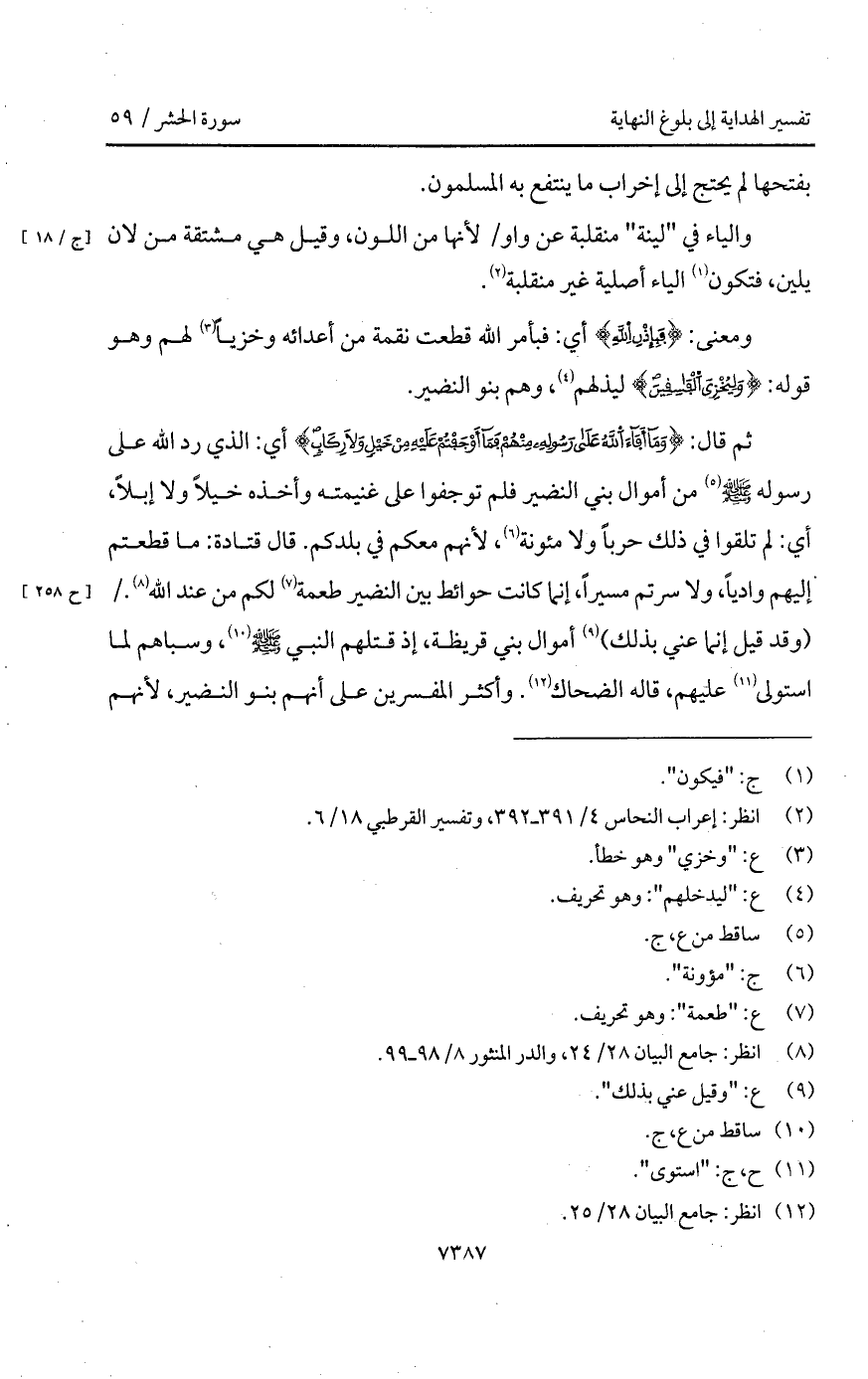 قال: {وَمَآ أَفَآءَ الله على رَسُولِهِ مِنْهُمْ فَمَآ أَوْجَفْتُمْ عَلَيْهِ مِنْ خَيْلٍ وَلاَ رِكَابٍ} أي: الذي رد الله على رسوله A من أموال بني النضير فلم توجفوا على غنيمته وأخذه خيلاً ولا إبلاً، أي: لم تلقوا في ذلك حرباً ولا مئونة، لأنهم معكم في بلدكم. قال قتادة: ما قطعتم إليهم وادياً، ولا سرتم مسيراً، إنما كانت حوائط بين النضير طعمة لكم من عند الله. / (وقد قيل إنما عني بذلك) أموال بني قريظة، إذ قتلهم النبي A، وسباهم لما استولى عليهم، قاله الضحاك. وأكثر المفسرين على أنهم بنو النضير، لأنهم