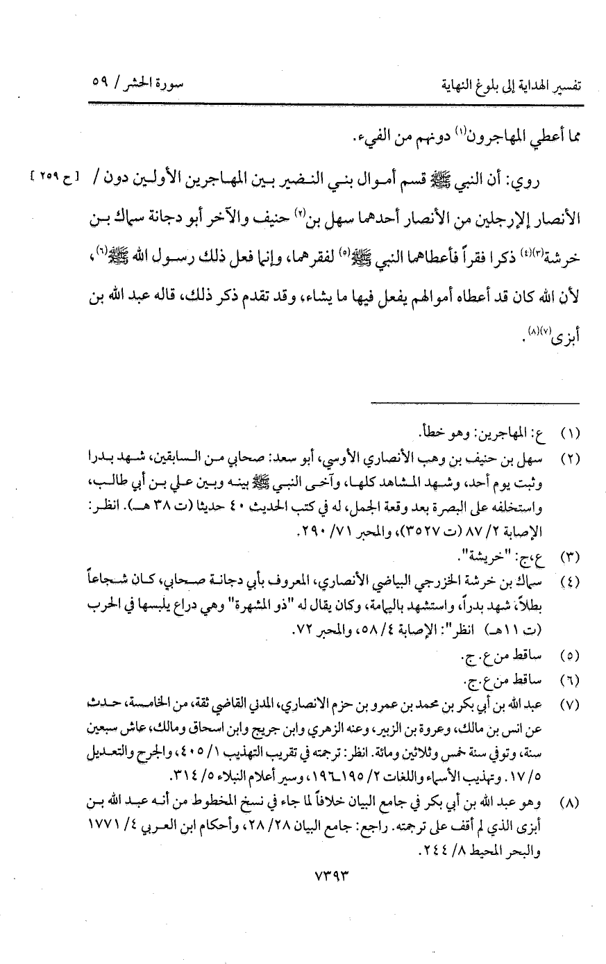 روي: أن النبي A قسم أموال بني النضير بين المهاجرين الأولين دون / الأنصار إلا رجلين من الأنصار أحدهما سهل بن حنيف والآخر أبو دجانة سماك بن خرشة ذكرا فقراً فأعطاهما النبي A لفقرهما، وإنما فعل ذلك رسول الله A، لأن الله كان قد أعطاه أموالهم يفعل فيها ما يشاء، وقد تقدم ذكر ذلك، قاله عبد الله بن أبزى.