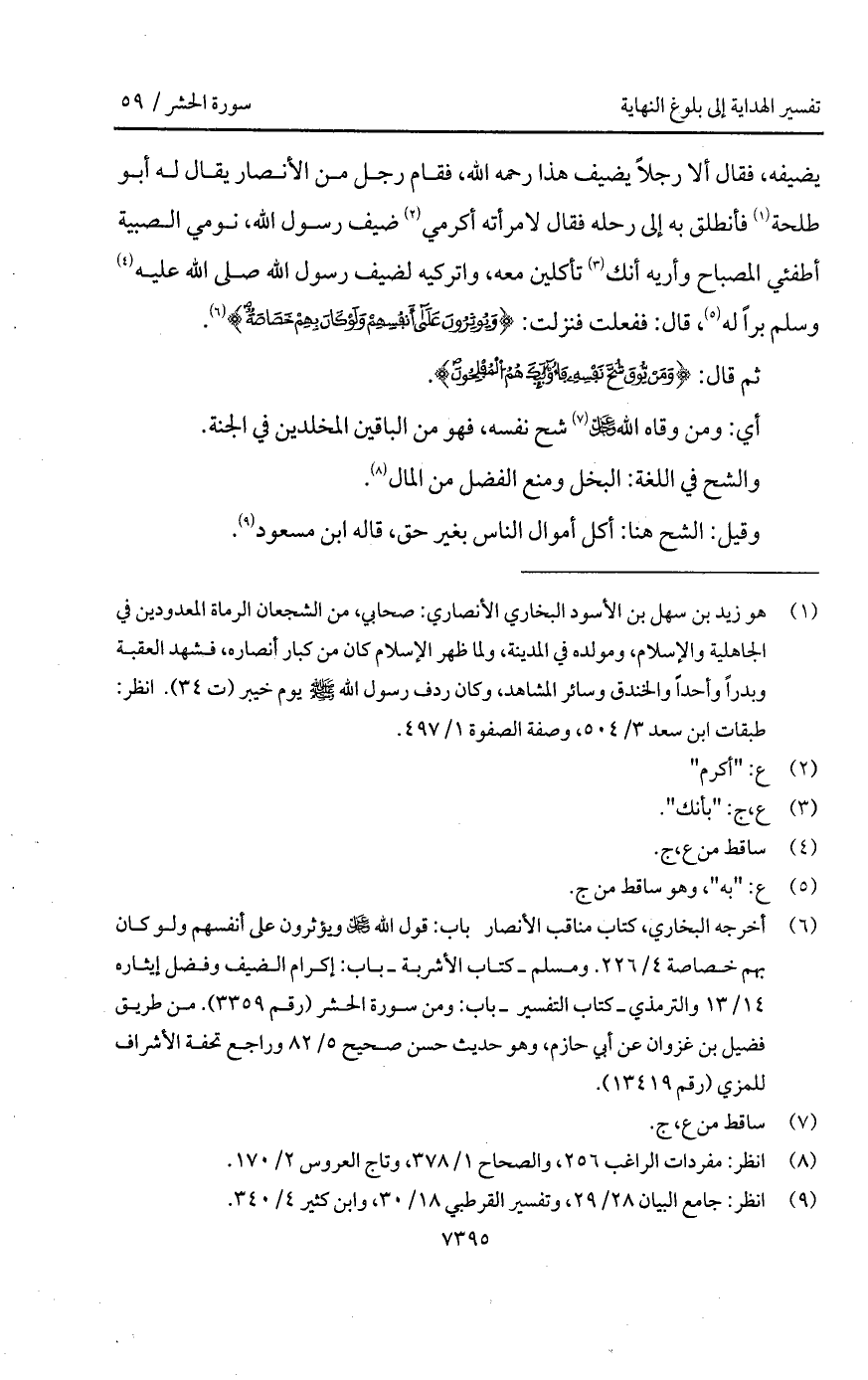 يضيفه، فقال ألا رجلاً يضيف هذا C، فقام رجل من الأنصار يقال له أبو طلحة فأنطلق به إلى رحله فقال لامرأته أكرمي ضيف رسول الله، نومي الصبية أطفئي المصباح وأريه أنك تأكلين معه، واتركيه لضيف رسول الله A براً له، قال: ففعلت فنزلت: {وَيُؤْثِرُونَ على أَنفُسِهِمْ وَلَوْ كَانَ بِهِمْ خَصَاصَةٌ} ".