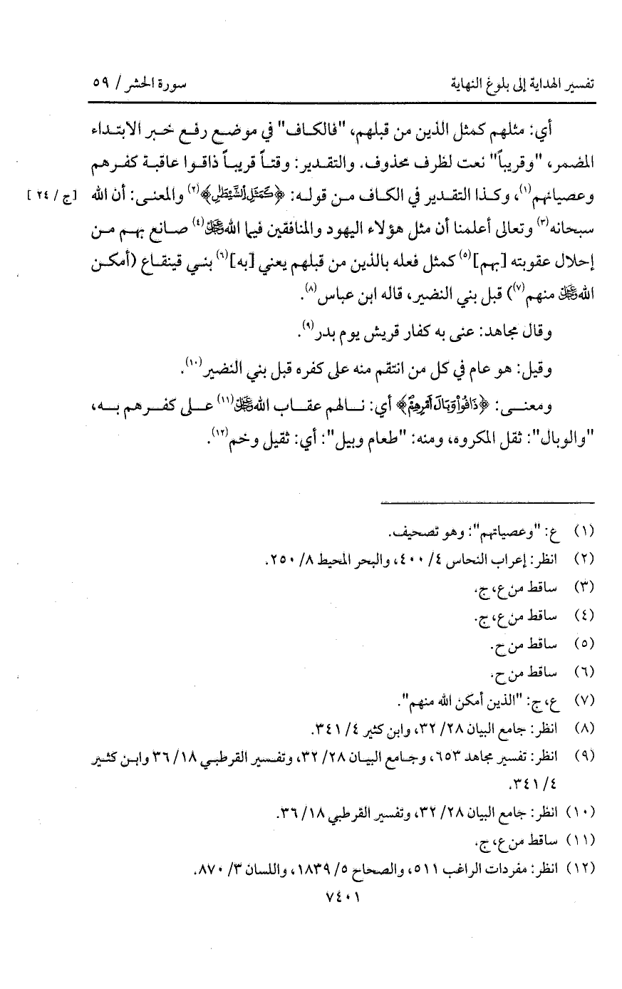 أي: مثلهم كمثل الذين من قبلهم، " فالكاف " في موضع رفع خبر الابتداء المضمر، " وقريباً " نعت لظرف محذوف. والتقدير: وقتاً قريباً ذاقوا عاقبة كفرهم وعصيانهم، وكذا التقدير في الكاف من قوله: {كَمَثَلِ الشيطان} والمعنى: أن الله سبحانه وتعالى أعلمنا أن مثل هؤلاء اليهود والمنفقين فيما الله D صانع بهم من إحلال عقوبته [بهم] كمثل فعله بالذين من قبلهم يعني [به] بني قينقاع (أمكن الله D منهم) قبل بني النضير، قاله ابن عباس.