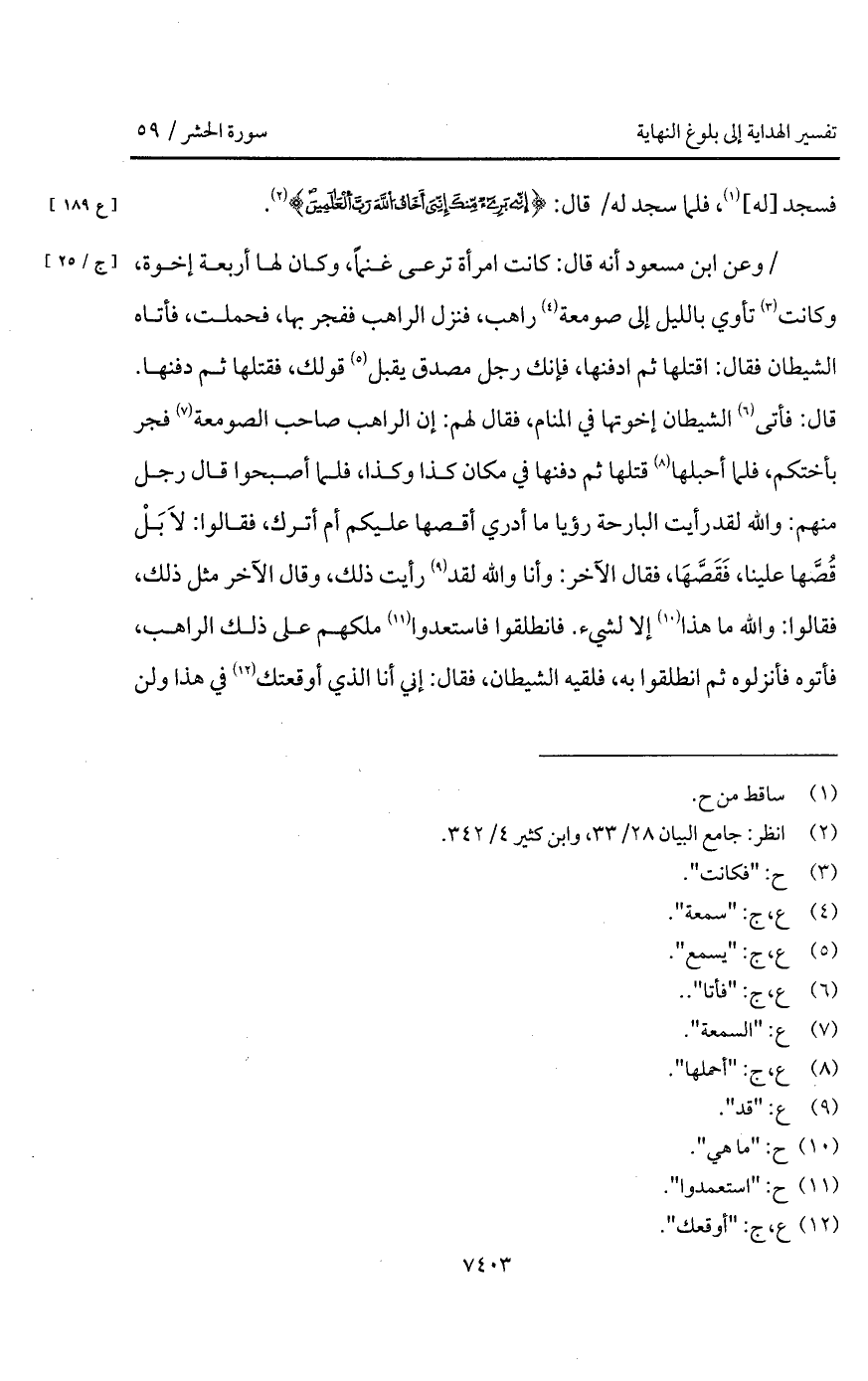 / وعن ابن مسعود أنه قال: كانت امراة ترعى غنماً، كان لها أربعة إخوة، وكانت تأوي بالليل إلى صومعة راهب، فنزل الراهب ففجر بها، فحملت، فأتاه الشيطان فقال: اقتلها ثم ادفنها، فإنك رجل مصدق يقبل قولك، فقتلها ثم دفنها. قال: فأتى الشيطان إخواتها في المنام، فقال لهم: إن الراهب صاحب الصومعة فجر بأختكم، فلما أحبلها قتلها ثم دفنها في مكان كذا وكذا، فلما أصبحوا قال رجل منهم: والله لقد رأيت البارحة رؤيا ما أدري أقصها عليكم أم أترك، فقالوا: لاَ بَلْ قُصَّها علينا، فَقَصَّهَا، فقال الآخر: وأنا والله لقد رأيت ذلك، وقال الآخر مثل ذلك، فقالوا: والله ما هذا إلا لشيء. فانطلقوا فاستعدوا ملكهم على ذلك الراهب، فقالوا: والله ما هذا إلا لشيء. فانطلقوا فاستعدوا ملكهم على ذلك الراهب، فأتوه فأنزلوه ثم انطلقوا به، فلقيه الشيطان، فقال: إني أنا الذي أوقعتك في هذا ولن