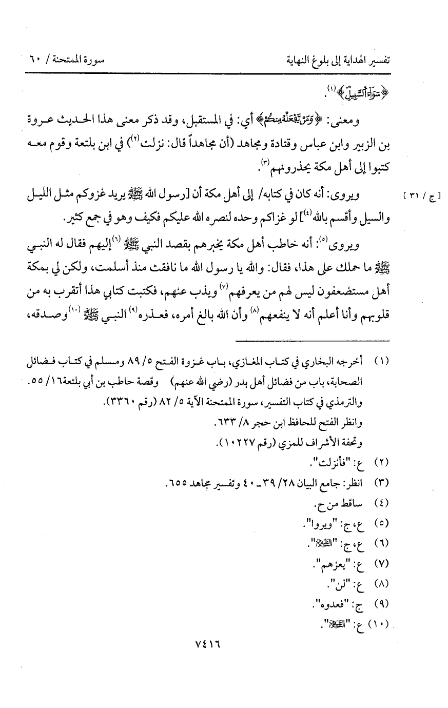 ويروى: " أنه خاطب أهل مكة يخبرهم بقصد النبي A إليهم فقال له النبي A ما حملك على هذا، فقال: والله يا رسول الله ما نافقت منذ أسلمت، ولكن لي بمكة أهل مستضعفون ليس لهم من يعرفهم ويذب عنهم، فكتبت كتابي هذا أتقرب به من قلوبهم وأنا أعلم أنه لا ينفعهم وأن الله بالغ أمره، فعذره النبي A وصدقه،