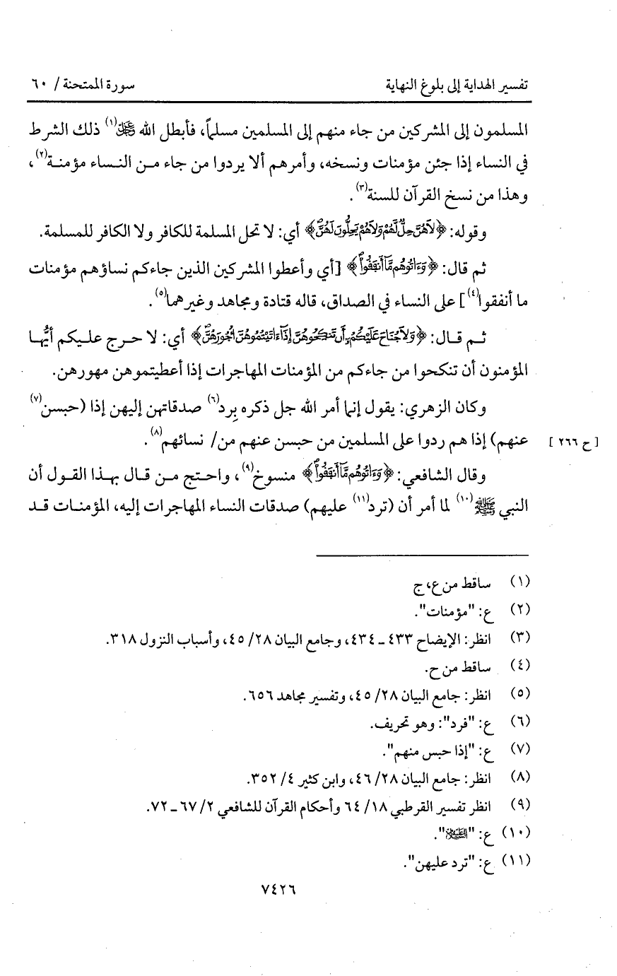 وقال الشافعي: {وَآتُوهُم مَّآ أَنفَقُواْ} منسوخ، واحتج من قال بهذا القول أن النبي A لما أمر أن (ترد عليهم) صدقات النساء المهاجرات إليه، المؤمنات قد