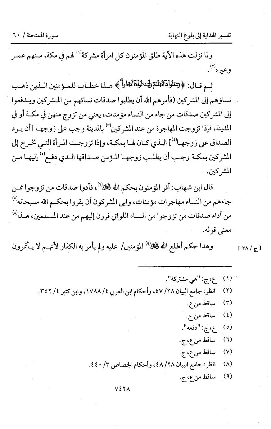 قال ابن شهاب: أقر المؤمنون بحكم الله D، فأدوا صدقات من تزوجوا ممن جاءهم من النساء مهاجرات مؤمنات، وابى المشركون أن يقروا بحكم الله سبحانه من أداء صدقات من تزوجوا من النساء اللواتي فررن إليهم من عند المسلمين، هذا معنى قوله.