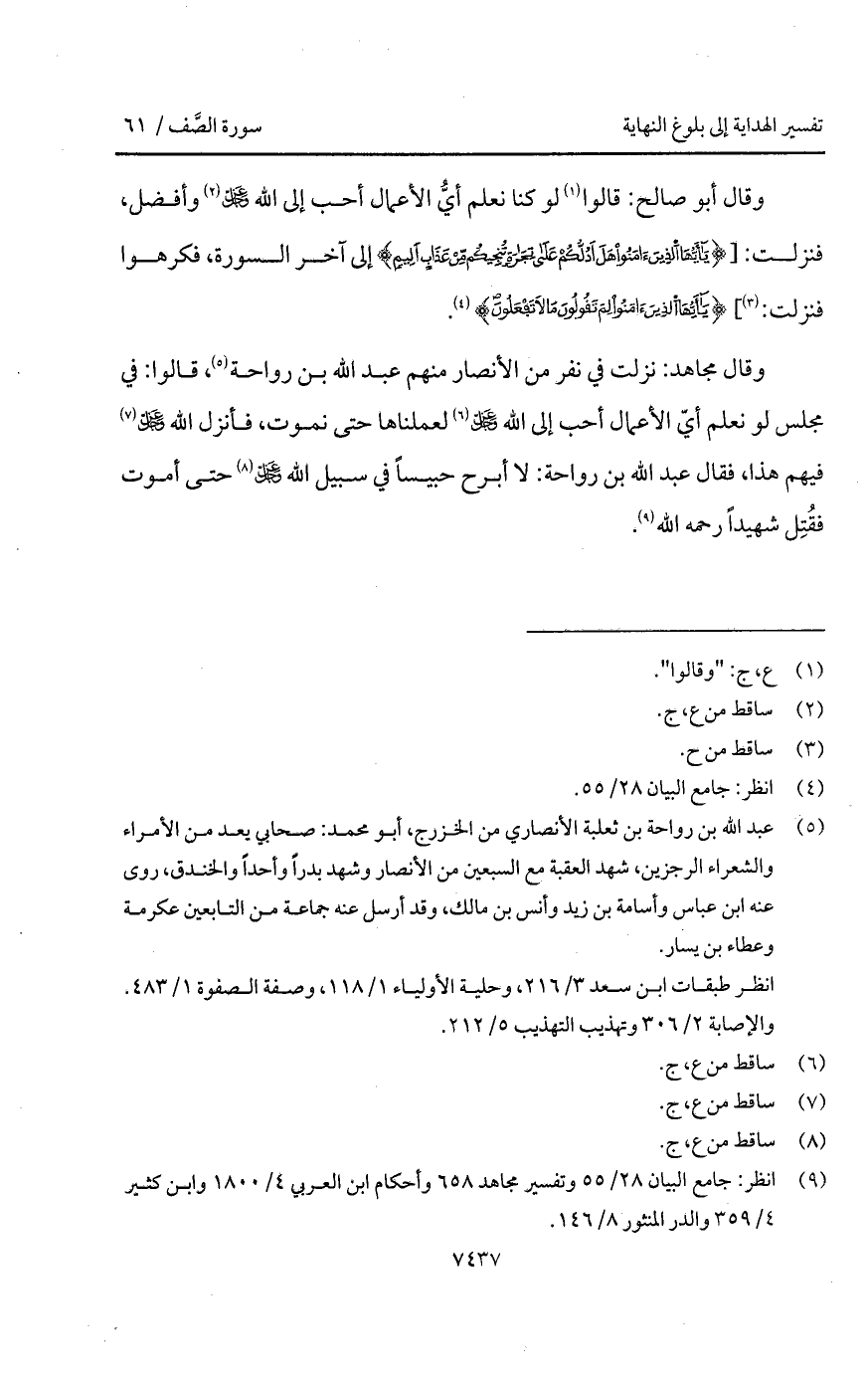وقال أبو صالح: قالوا لو كنا نعلم أيُّ الأعمال أحب إلى الله D وأفضل، فنزلت: [{يا أيها الذين آمَنُواْ هَلْ أَدُلُّكمْ على تِجَارَةٍ تُنجِيكُم مِّنْ عَذَابٍ أَلِيمٍ} إلى آخر السورة، فكرهوا فنزلت:] {يا أيها الذين آمَنُواْ لِمَ تَقُولُونَ مَا لاَ تَفْعَلُونَ}.