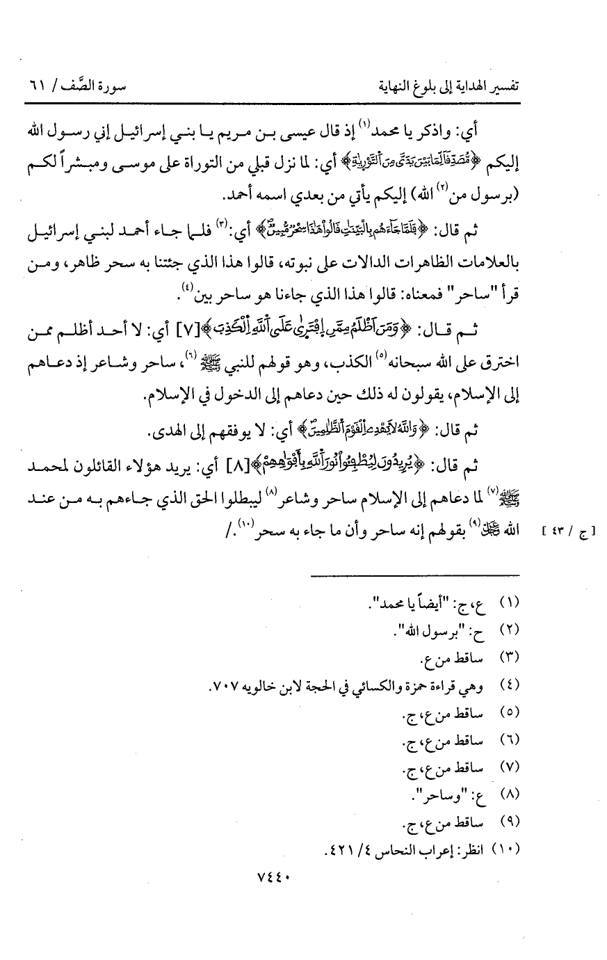 قال: {يُرِيدُونَ لِيُطْفِئُواْ نُورَ الله بأفواههم} أي: يريد هؤلاء القائلون بمحمد A لما دعاهم إلى الإسلام ساحر وشاعر ليبطلوا الحق الذي جاءهم به من عند الله D بقولهم إنه ساحر وأن ما جاء به سحر. /