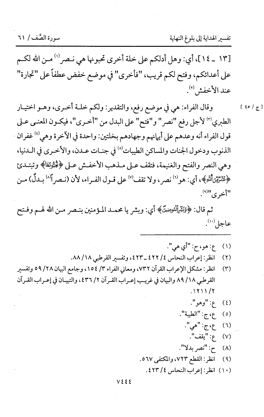 وقال الفراء: هي في موضع رفع، والتقدير: ولكم خلة أخرى، وهو اختيار الطبري لأجل رفع " نصر " و " فتح " على البدل من " أخرى "، فيكون المعنى على قول الفراء أنه وعدهم على إيمانهم وجهادهم بخلتين: واحدة في الآخرة وهي غفران الذنوب ودخول الجنات والمساكن الطيبات في جنات عدن، والأخرى في الدنيا، وهي النصر والفتح والغنيمة، فتقف على مذهب الأخفش على {تُحِبُّونَهَا} وتبتدئ {نَصْرٌ مِّن الله}، أي: هو نصر، ولا تقف على قول الفراء، لأن (نصراً بدلٌ) من " أخرى ".