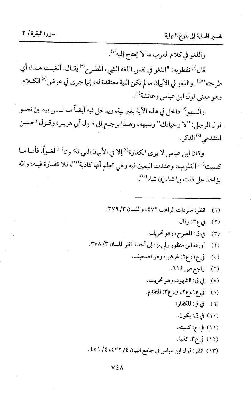 قال نفطويه: " اللغو في نفس اللغة الشيء المطرح يقال: ألغيت هذا، أي طرحته ". واللغة في الأيمان ما لم تكن النية معتقدة له، إنما في عرض الكلام. وهو معنى قول ابن عباس وعائشة.