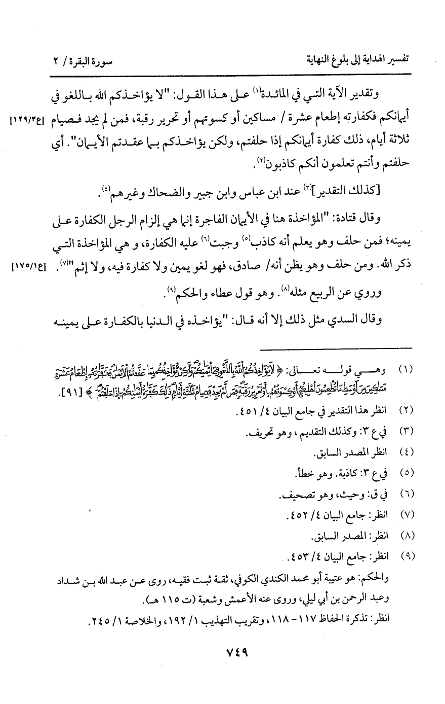 وتقدير الآية التي في المائدة على هذا القول: " لا يؤاخذكم الله باللغو في أيمانكم فكفارته إطعام عشرة/ مساكين أو كسوتهم أو تحرير رقبة، فمن لم يجد فيصام ثلاثة أيام، ذلك كفارة أيمانكم إذا حلفتم، ولكن يؤاخذكم بما عقدتم الأيمان ". أي حلفتم وأنتم تعلمون أنكم كاذبون.