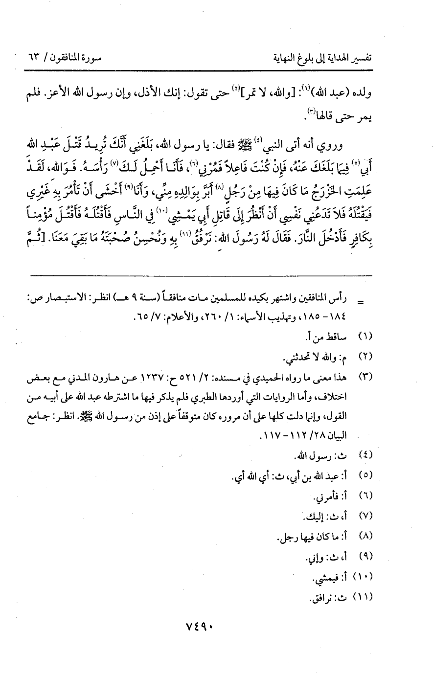 " وروي أنه أتى النبي A فقال: يا رسول لله، بَلَغَنِي أَنَّكَ تُرِيدُ قَتْلَ عَبْدِ الهِ أَبي فِيمَا بَلَغَكَ عَنْهُ، فَإِنْ كُنْتَ فَاعِلاً فُمُرْنِي، فَأَنَا أَحْمِلُ لَكَ رَأْسَهُ. فَوَاللهِ، لَقَدْ عَلِمَتِ الخَزْرَجُ مَا كَانَ فِيهَا مِنْ رَجُلٍ أَبَرَّ بِوَالِدِهِ مِنِّي، وَأَنَا أَخْشَى أَنْ تَأْمُرَ بِهِ غَيْرِي فَيَقْتُلَهُ فَلاَ تَدَعُنِي نَفْسِي أَنْ أَنْظُرَ إِلَى قَاتِلِ أَبِي يَمْشِي فِي النَّاسِ فَأَقْتُلَهُ فَأَقْتُلَهُ فَأَقْتُلَ مُؤْمِناً بِكَافِرٍ فَأَدْخُلَ النَّارَ. فَقَالَ لَهُ رَسُولَ اللهِ: نَرْفُقُ بِهِ وَنُحْسِنُ صُحْبَتَهُ مَا بَقِيَ مَعَنَا. [ثُمَّ
