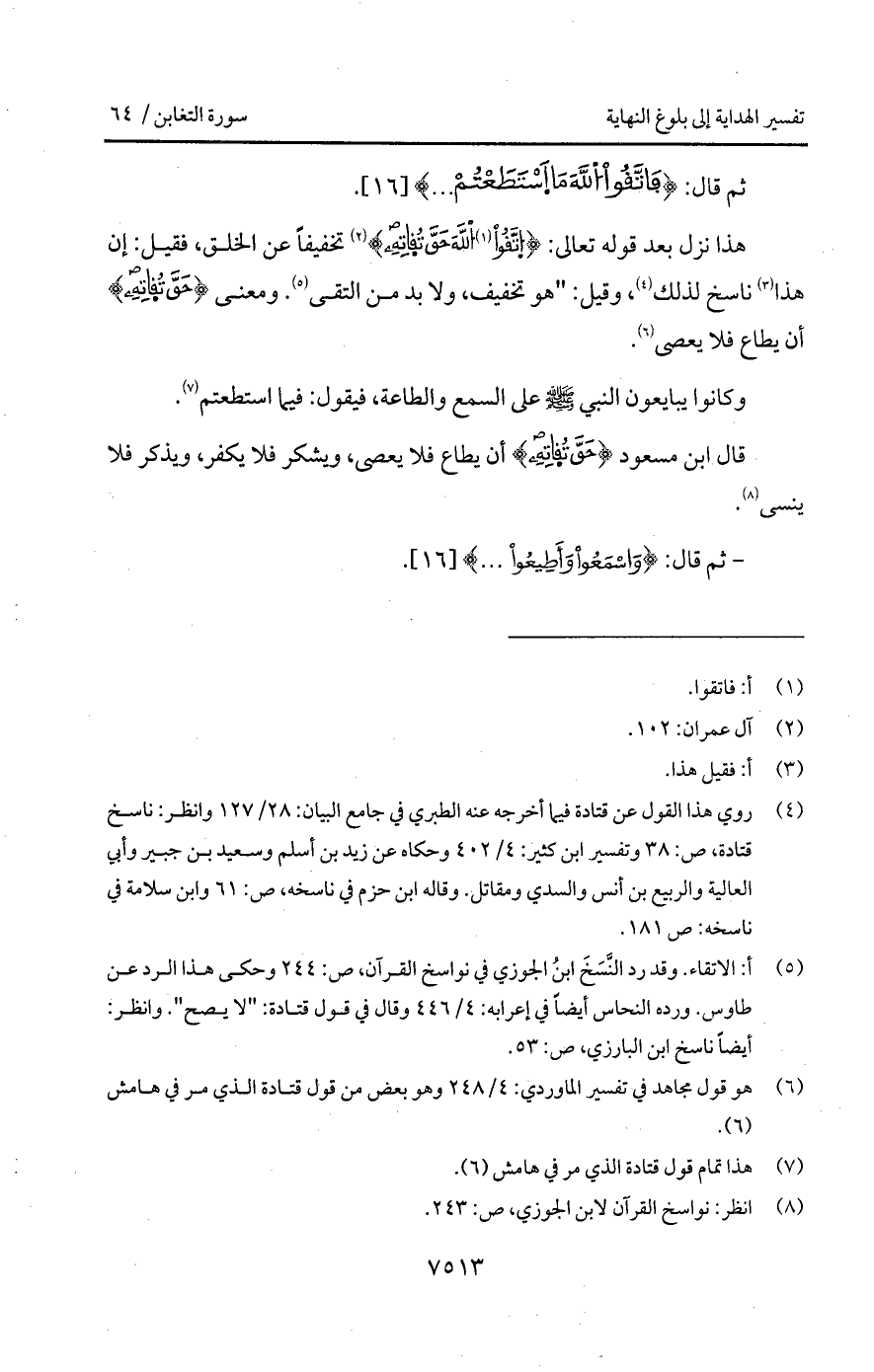هذا نزل بعد قوله تعالى: {اتقوا الله حَقَّ تُقَاتِهِ} [آل عمران: 102] تخفيفاً عن الخلق، فقيل: إن هذا ناسخ لذلك، وقيل: " هو تخفيف، ولا بد من التقى. ومعنى {حَقَّ تُقَاتِهِ} أن يطاع فلا يعصى.
