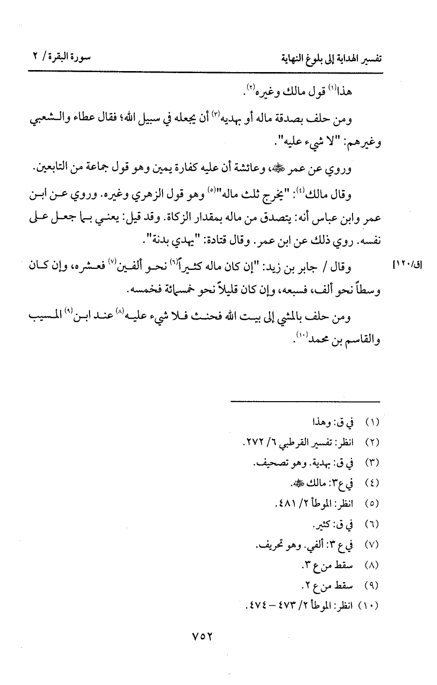 وقال مالك: " يخرج ثلث ماله " وهو قول الزهري وغيره. وروي عن ابن عمر وابن عباس أنه: يتصدق من ماله بمقدار الزكاة. وقد قبل: يعني بما جعل على نفسه. روي ذلك عن ابن عمر. وقال قتادة: " يهدي بدنة ".