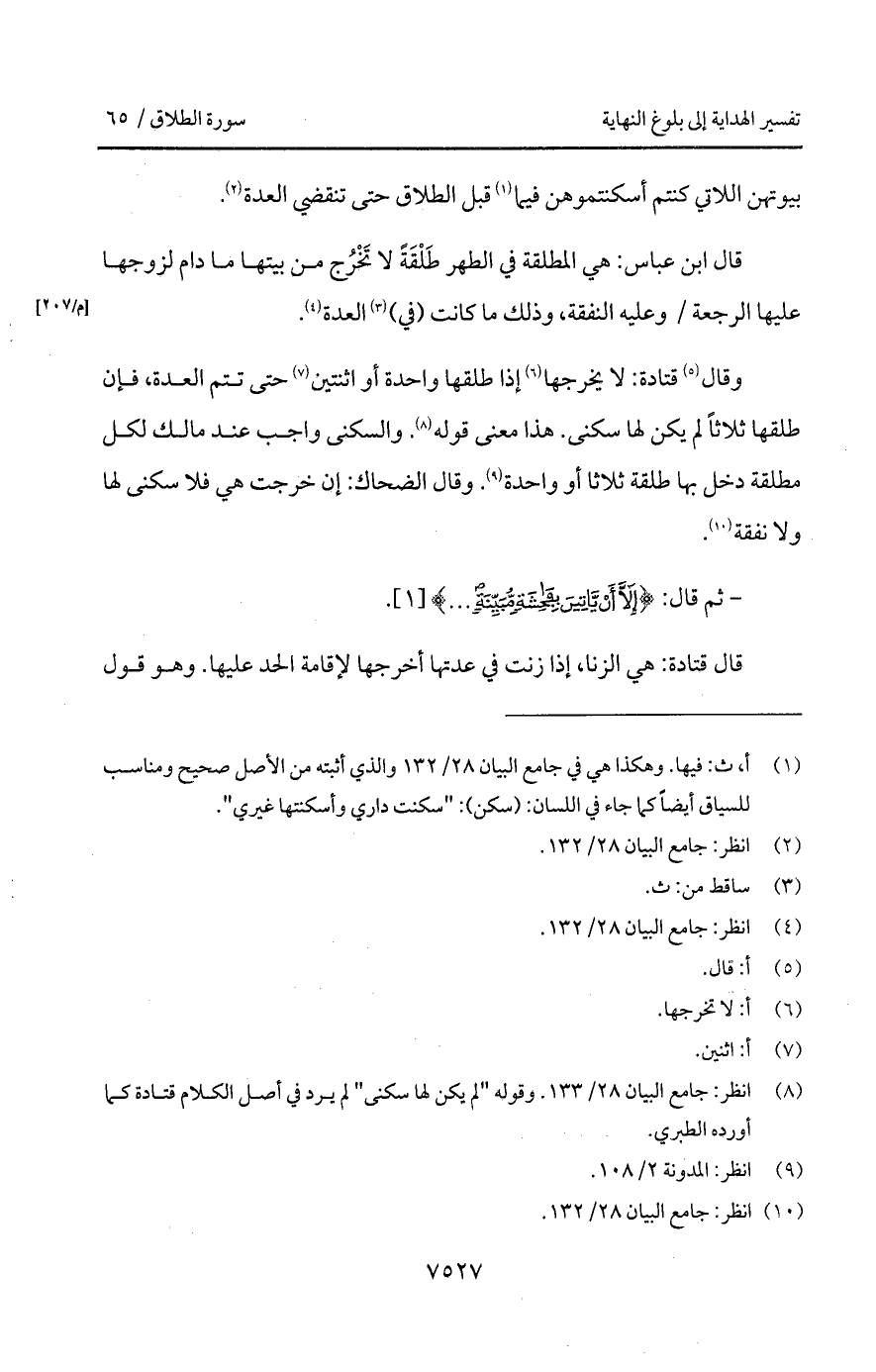 قال ابن عباس: هي المطلقة في الطهر طَلْقَةً لا تَخْرُج من بيتها ما دامم لزوجها عليها الرجعة/ وعليه النفقة، وذلك ما كانت (في) العدة.