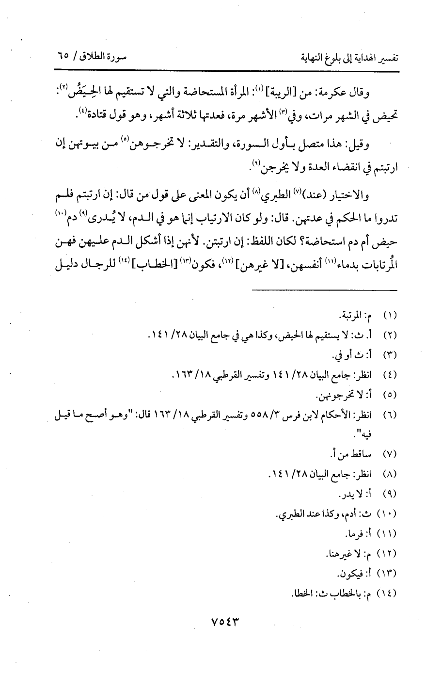والاختيار (عند) الطبري أن يكون المعنى على قول من قال: إن ارتبتم فلم تدروا ما الحكم في عدتهن. قال: ولو كن الارتياب إنما هو في الدم، لا يُدرى دم حيض أم دم استحاضة؟. لكان اللفظ: إن ارتبتن. لأنهن إذا أشكل الدم عليهن فهن المُرتابات بدماء أنفسهن، [لا غيرهن]، فكون [الخطاب] للرجال دليل