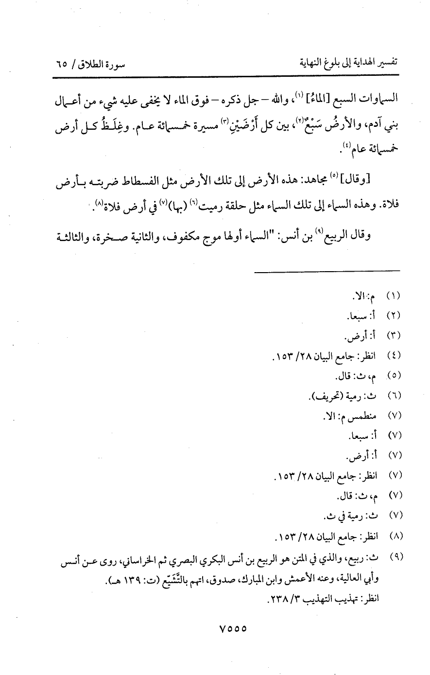 السماوات السبع [الماءُ]، والله - جل ذكره - فوق الماء لا يخفى عليه شيء من أعمال بني آدم، والأرضُ سَبْعٌ، بين كل أَرْضَيْنِ مسيرة خمسمائة عام. وغِلَظُ كل أرض خمسمائة عام.