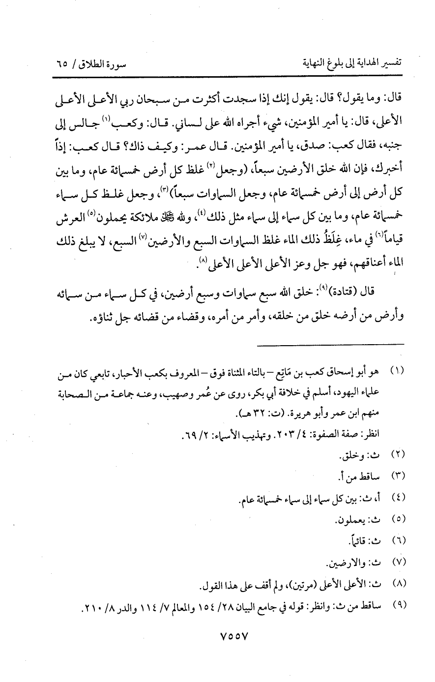 قال: وما يقول؟ مقال: يقول إنك إذا سجدت أكثرت من سبحان ربي الأعلى الأعلى الأعلى، قال: يا أمير المؤمنين، شيء جراه الله على لساني. قال: وكعب جالس إلى جنبه، فقال كعب: صدق، يا أمير المؤمنين. قال عمر: وكيف ذاك؟ قال كعب: إذاً أخبرك، فإن الله خلق الأرضين سبعاً، (وجعل غلظ كل أرض خمسمائة عام، وما بين كل أرض إلى أرض خمسمائة عام، وجعل السماوات سبعاً)، وجعل غلظ كل سماء خمسمائة عام، وما بين كل سماء إلى سماء مثل ذلك، والله D ملائكة يحملون العرش قياماً في ماء، غِلَظُ ذلك الماء غلظ السماوات السبع والأرضين السبع، لا يبلغ ذلك الماء أعناقهم، فهو جل وعز الأعلى الأعلى الأعلى.