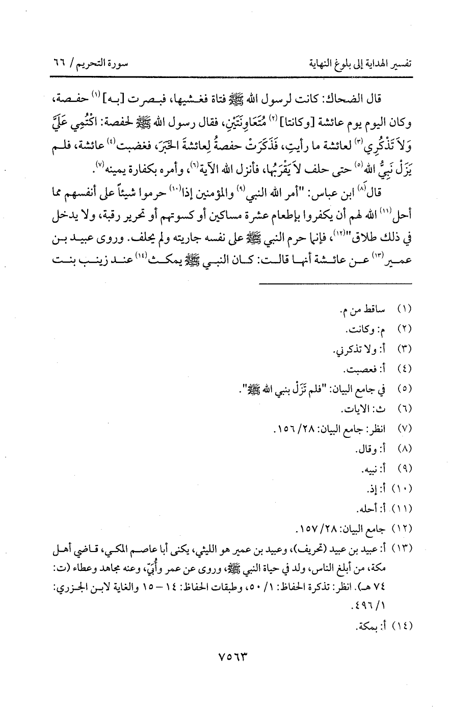 قال ابن عباس: " أمر الله النبي والمؤمنين إذا حرما شيئاً على أنفسهم مما أحل الله لهم أن يكفروا بإطعام عشرة مساكين أو كسوتهم أو تحرير رقبة، ولا يدخل في ذلك طلاق "، فإنما حرم النبي A على نفسه جاريته ولم يحلف. وروى عبيد بن عمير عن عائشة أنها قالت: " كان النبي A يمكث عند زينب بنت