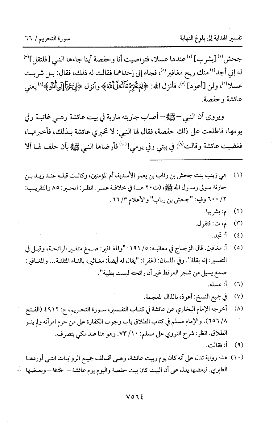 جحش [يشرب] عندها عسلا، فتواصيت أنا وحفصة أينا جاءها النبي [فلتقل] له إن أجد منك ريح مغافير، فجاء إلى إحداهما فقالت له ذلك، فقال: بل شربت عسلا، ولن [أعود]، فأنزل الله: {لِمَ تُحَرِّمُ مَآ أَحَلَّ الله} وأنزل {إِن تَتُوبَآ إِلَى الله} يعني عائشة وحفصة ".
