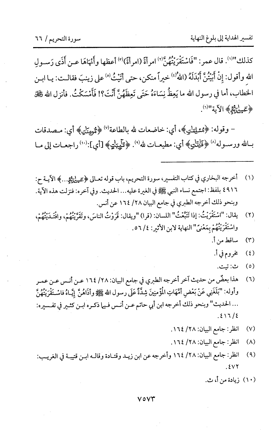 كذلك ". قال عمر: " فَاسْتَقْرَيْتُهُنَّ امرأةً (امرأةً) أعظها وأَنْهَاهاَ عن أَذَى رَسولِ اللهِ وأقول: إِنْ أَبَيْتُنَّ أَبْدَلَهُ (اللهُ خيراً منكن، حتى أَتَيْتُ على زَينبَ فقالت: يا ابن الخطاب، أما في رسول الله ما يَعِظُ نِسَاءَهُ حَتَى تَعِظَهُنَّ أَنْتَ؟! فَأَمْسَكْتُ. فأنزل الله D { عسى رَبُّهُ} الآية ".