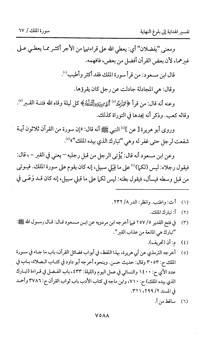 وروى أبو هريرة [عن] النبي - صلى الله عليه وسلم - أنه قال: "إن سورة من القرآن ثلاثون آية شفعت لرجل حتى غفر له وهي "تبارك الذي بيده الملك".