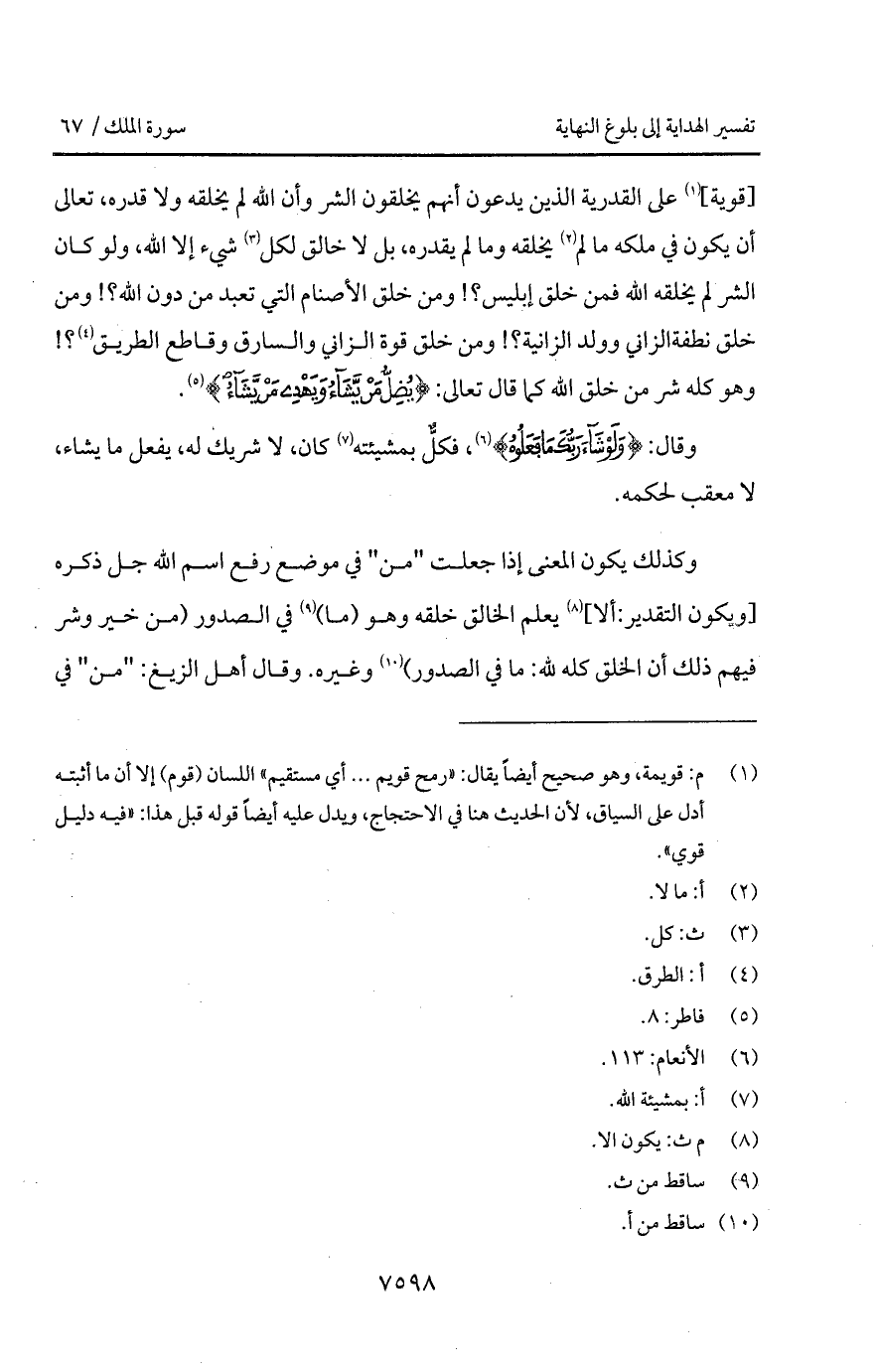 [قوية] على القدرية الذين يدعون أنهم يخلقون الشر وأن الله لم يخلقه ولا قدره، تعالى أن يكون في ملكه ما لم يخلقه بقدره، بل لا خالق لكل شيء إلا الله، ولو كان الشر لم يخلقه الله فمن خلق إبليس؟! ومن خلق الأصنام التي تبعد من دون الله؟! ومن خلق نطفة الزاني وولد الزانية؟! ومن خلق قوة الزاني والسارق وقاطع الطريق؟! وهو كله شر من خلق الله كما قال تعالى: {يُضِلُّ مَن يَشَآءُ وَيَهْدِي مَن يَشَآءُ} [فاطر: 8].