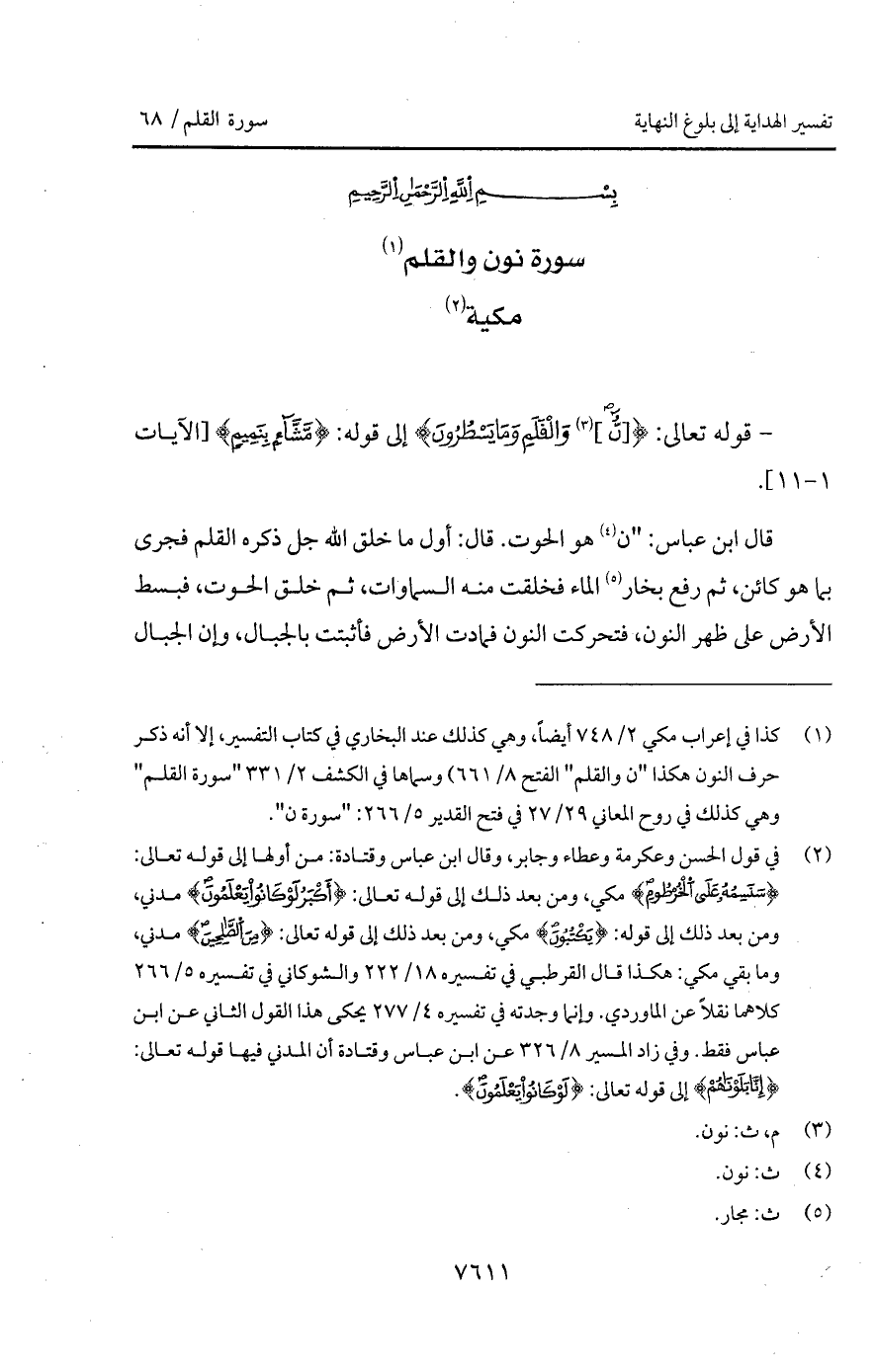 قال ابن عباس: " ن هو الحوت. قال: أول ما خلق الله جل ذكره القلم فجرى بما هو كائن، ثم رفع بخار الماء فخلقت منه السماوات، ثم خلق الحوت، فبسط الأرض على ظهر النون، فتحركت النون فمادت الأرض فأثبتت بالجبال، وإن الجبال