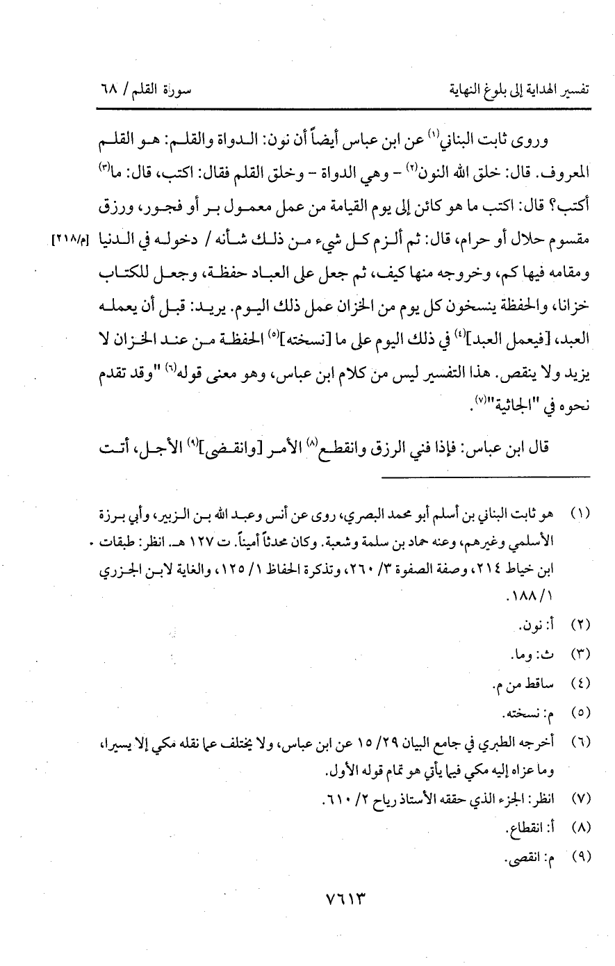 وروى ثابت البناني عن ابن عباس أيضاً نون: الدواة والقلم: هو القلم المعروف. قال: خلق الله النون - وهي الدواة - وخلق القلم فقال: اكتب، قال: ما أكتب؟ قال: اكتب ما هو كائن إلى يوم القيامة من عمل معمول بر أو فجور، ورزق مقسوم حلال أو حرام، قال: ثم ألزم كل شيء من ذلك شأنه/ دخوله في الدنيا ومقامه فيها كم، وخروجه منها كيف، ثم جعل على العباد حفظة، وجعل للكتاب خزانا، والحفظة ينسخون كل يوم من الخزان عمل ذلك اليوم. يريد: قبل أن يمله العبد، [فيعمل العبد] في ذلك اليوم على ما [نسخته] الحفظة من عند الخزان لا يزيد ولا ينقص. هذا التفسير ليس من كلام ابن عباس، وهو معنى قوله " وقد تقدم نحوه في " الجاثية ".