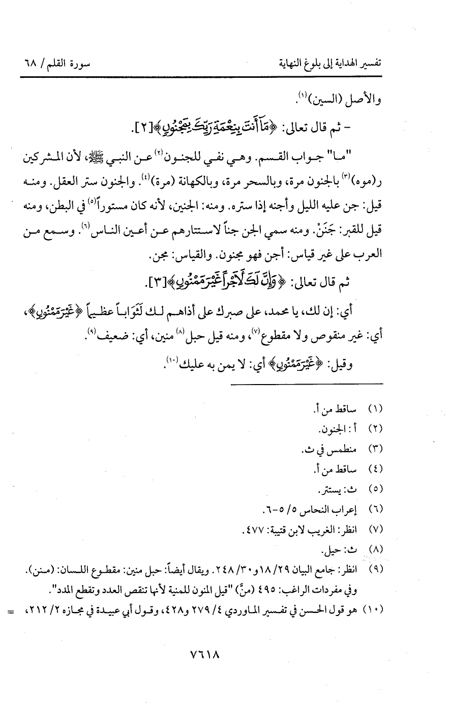 " ما " ما جواب القسم. وهي نفي للجنون عن النبي A، لأن المشركين ر (موه) بالجنون مرة، وبالسحر مرة، وبالكهانة (مرة). والجنون ستر العقل. ومنه قيل: جن عليه الليل وأجنة إذا ستره. ومنه: الجنين، لأنه كان مستوراً في البطن، ومنه قيل للقبر: جَنَنْ منه سمي الجن حناً لاستتارهم عن أعين الناس. وسمع من العرب على غير قياس: أجن فهو مجنون. والقياس: مجن.