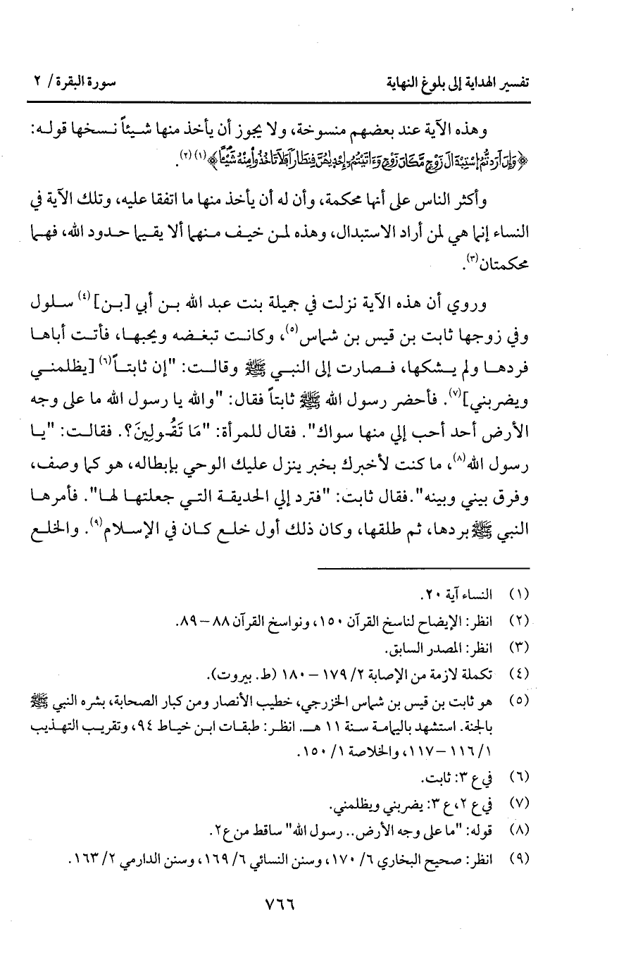 " وروي أن هذه الآية نزلت في جميلة بنت عبد الله بن أبي [بن] سلول وفي زوجها ثابت بن قيس بن شماس، وكانت تبغضه ويحبها، فأتت أباها فردها ولم يشكها، فصارت إلى النبي A وقالت: " إن ثابتاً [يظلمني ويضربني]. فأحضر رسول الله A ثابتاً فقال: " والله يا رسول الله ما على وجه الأرض أحد أحب إلي منها سواك ". فقال للمرأة: " مَا تَقُولينَ؟. فقالت: " يا رسول الله، ما كنت لأخبرك بخبر ينزل عليك الوحي بإبطاله، هو كما وصف، وفرق بيني وبينه ". فقال ثابت: " فترد إلي الحديقة التي جعلتها لها ". فأمرها النبي A بردها، ثم طلقها "