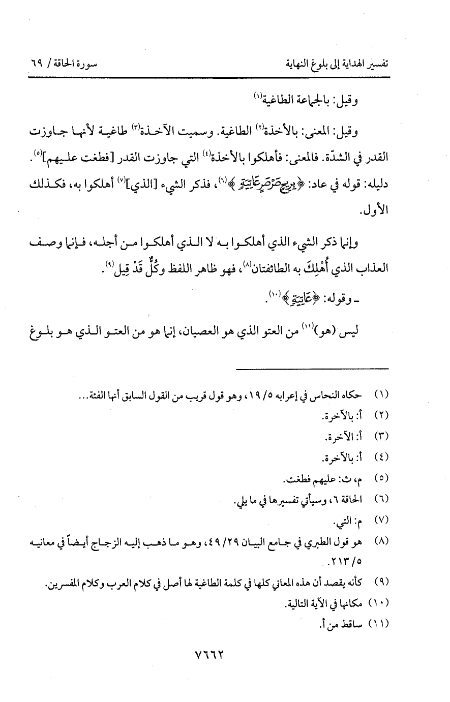 وقيل: المعنى: بالأخذة الطاغية. وسميت الآخذة طاغية لأنها جاوزت القدر في الشدّة. فالمعنى: فأهلكوا بالأخذة التي جاوزت القدر [فطغت عليهم]. دليله: قوله في عاد: {بِرِيحٍ صَرْصَرٍ عَاتِيَةٍ}، فذكر الشيء [الذي] أهلكوا من أجله، فإنما وصف العذاب الذي أُهْلِكَ به الطائفتان، فهو ظاهر اللفظ وكُلُّ قَدْ قِيل.