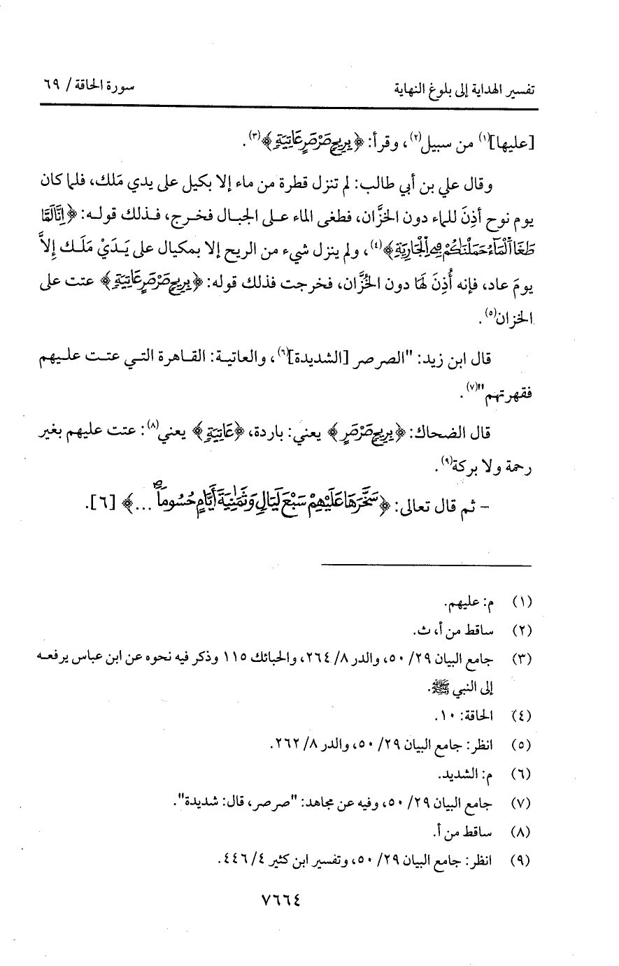 وقال علي بن أبي طالب: لم تنزل قطرة من ماء إلا بكيل على يدي مَلك، فلما كان يوم نوح أذِنَ للماء دون الخزَّان، فطغى الماء على الجبال فخرج، فذلك قوله: {إِنَّا لَمَّا طَغَا المآء حَمَلْنَاكُمْ فِي الجارية} إلى قوله: {فِي الجارية}، ولم ينزل شيء من الريح إلا بمكيال على يَدَيْ مَلَك إِلاَّ يومَ عاد، فإنه أُذِنَ لَهَا دون الخُزَّان، فخرجت فذلك قوله: {بِرِيحٍ صَرْصَرٍ عَاتِيَةٍ} عتت على الخزان.