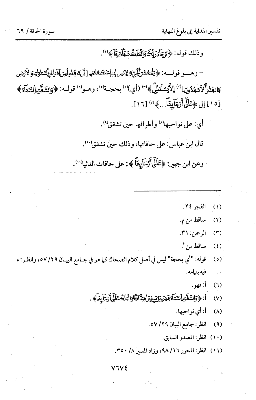 - وهو قوله: {يامعشر الجن والإنس إِنِ استطعتم [أَن تَنفُذُواْ مِنْ أَقْطَارِ السماوات والأرض فانفذوا لاَ تَنفُذُونَ] إِلاَّ بِسُلْطَانٍ} [الرحمن: 33] (أي] بحجة، وهو قوله: {وانشقت السمآء}. إلى {على أَرْجَآئِهَآ. . .}.