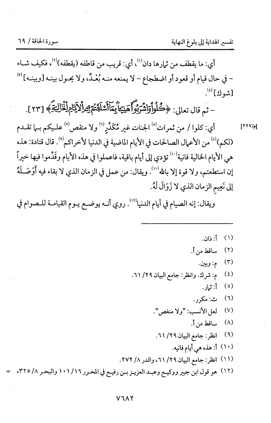أي: كلوا/ من ثمرات الجنات غير مُكَدَّرٍ ولا منقص عليكم بما تقدم (لكم) من الأعمال الصالحات في الأيام الماضية في الدنيا لأخراكم. قال قتادة: هذه الأيام الخالية فانية تؤدي إلى أيام باقية، فاعملوا في هذه الأيام وقَدِّما فيها خيراً إن استطعتم، ولا قوة إلا بالله. ويقال: من عمل في الزمان الذي لا بقاء فيه أَوْصَلَهُ إلى نَعِيمِ الزمان الذي لا زَوَالَ لَهُ.