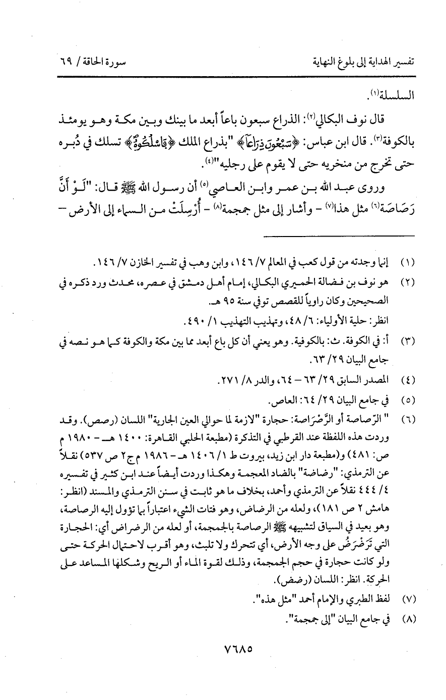 قال نوف البكالي: الذراع سبعون ذراعاً أبعد ما بينك وبين مكة وهو يومئذ بالكوفة. قال ابن عباس: {سَبْعُونَ ذِرَاعاً} " بذراع الملك {فَاسْلُكُوهُ} تسلك في دُبره حتى تخرج من منخريه حتى لا يقوم على رجليه ".