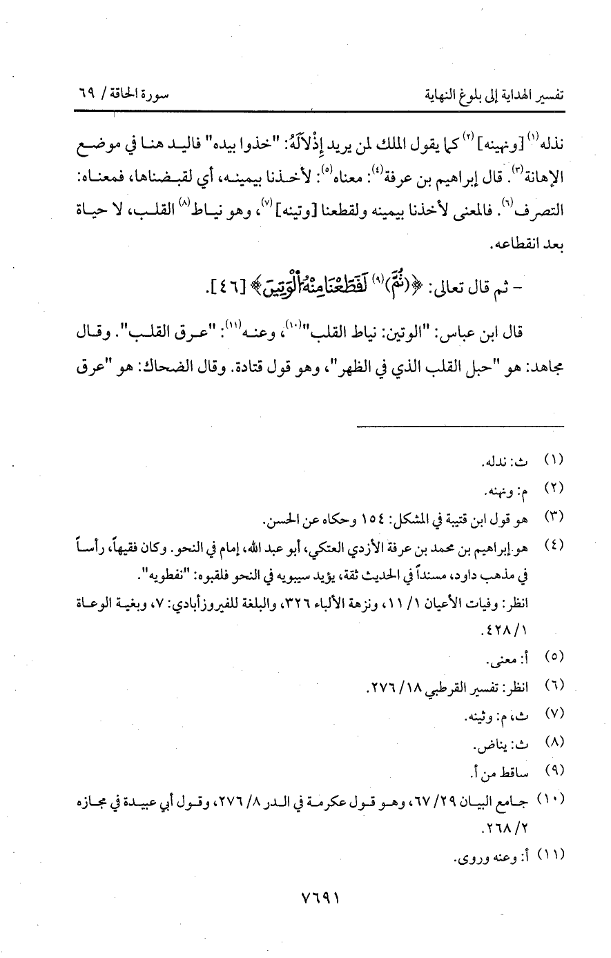 قال ابن عباس: " الوتين: نياط القلب "، وعنه: " عرق القلب ". وقال مجاهد: هو " حبل القلب الذي في الظهر "، وهو قول قتادة. وقال الضحاك: هو " عرق