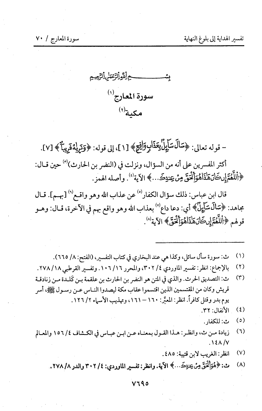 - قوله تعالى: {سَأَلَ سَآئِلٌ بِعَذَابٍ وَاقِعٍ}، إلى قوله: {وَنَرَاهُ قَرِيباً}.