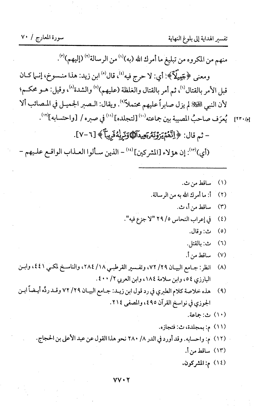 ومعنى {جَمِيلاً}: أي: لا حرج فيه، قال ابن زيد: هذا منسوخ، إنما كان قبل الأمر بالقتال، ثم أمر بالقتال والغلظة (عليهم) والشدة، وقيل: هو محكم؛ لأن النبي عليه السلام لم يزل صابراً عليهم محتملاً. ويقال: الصبر الجميل في المصائب ألا يُعرَف صاحبُ المصيبة بن جماعته [لتجلده] في صبره/ [واحتسابه].
