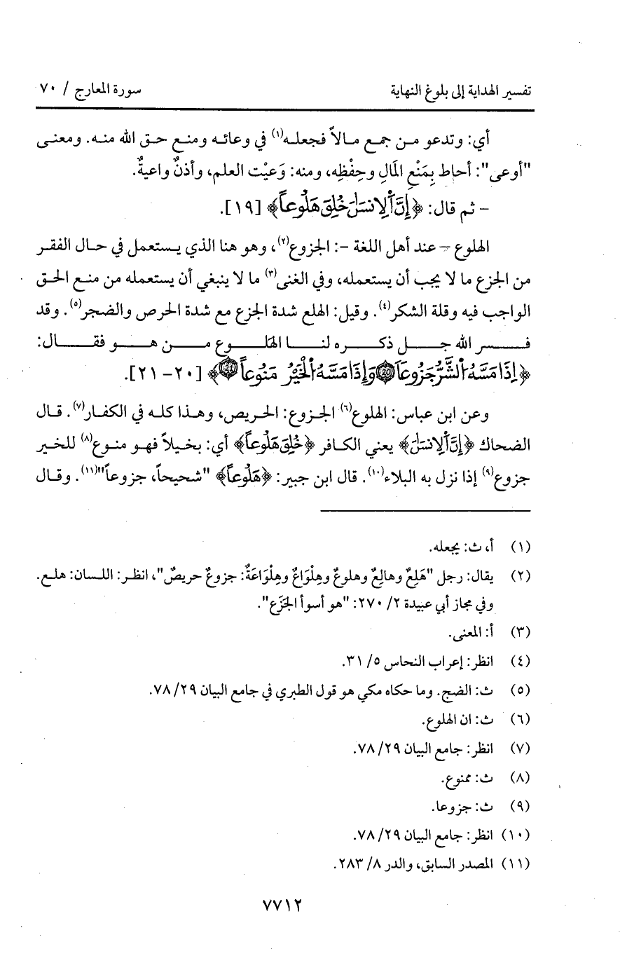 الهلوع - عند أهل اللغة -: الجزوع، وهو هنا الذي يستعمل في حال الفقر من الجزع ما لا يجب أن يستعمله، وفي الغنى ما لا ينبغي أن يستعمله من منع الحق الواجب فيه وقلة الشكر. وقيل: الهلع شدة الجزع من شدة الحرص والضجر. وقد فسر الله جل ذكره لنا الهَلوع من هو فقال: {إِذَا مَسَّهُ الشر جَزُوعاً * وَإِذَا مَسَّهُ الخير مَنُوعاً}.