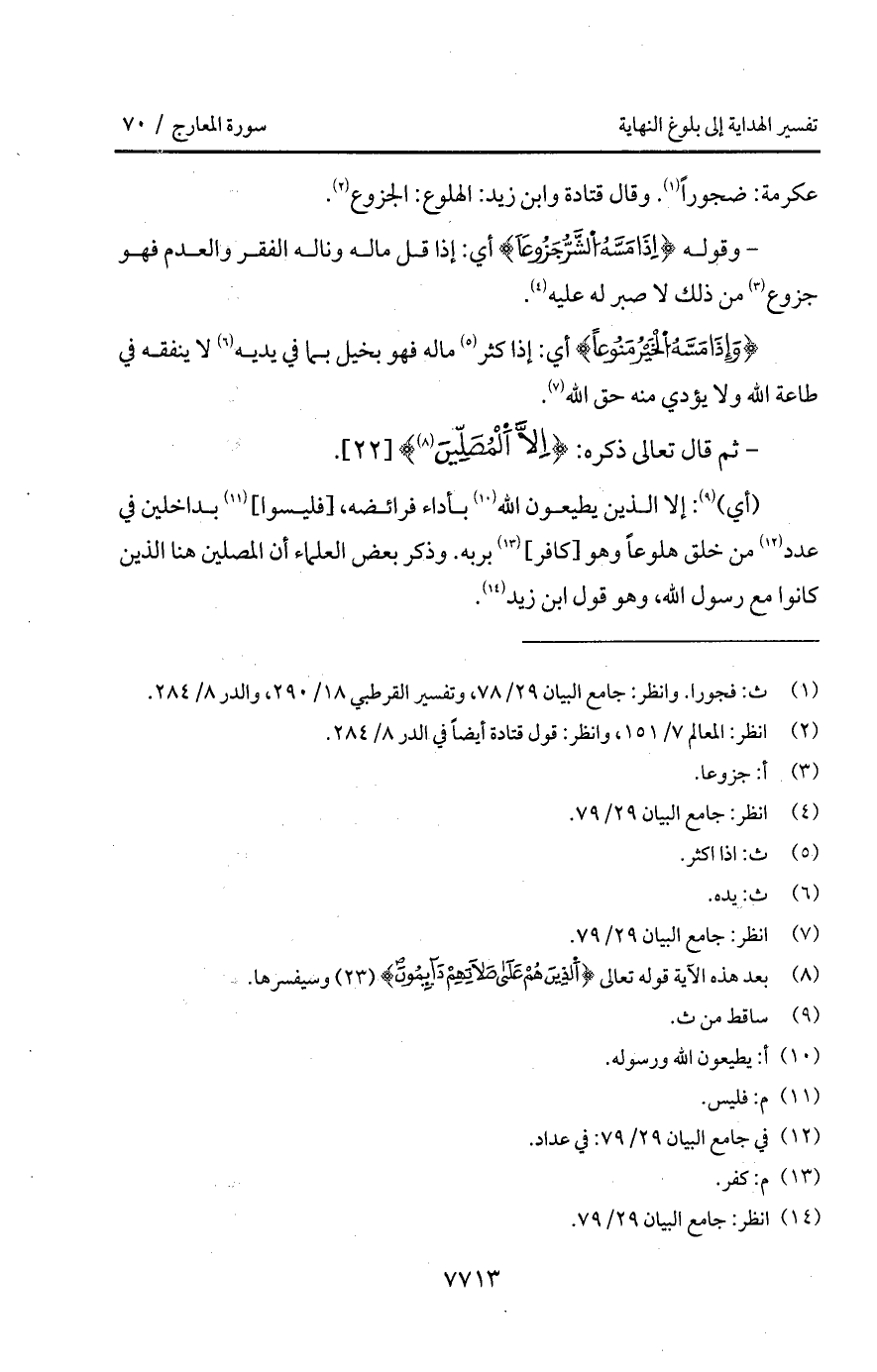 (أي): إلا الذين يطيعونن الله بأداء فرائضه، [فليسوا] بداخلين في عدد من خلق هلوعاً وهو [كافر] بربه. وذكر بعض العلماء أن المصلين هنا الذين كانوا مع رسول الله، وهو قول ابن زيد.