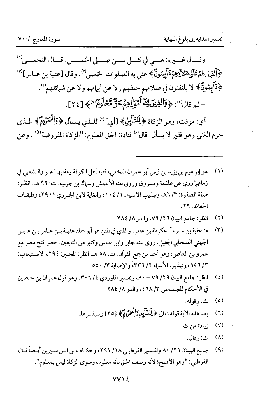 وقال غيره: هي في كل من صلى الخمس: قال النخعي {الذين هُمْ على صَلاَتِهِمْ دَآئِمُونَ} عني به الصلوات الخمس. وقال [عقبة بن عامر] {دَآئِمُونَ} لا يلتفتون في صلاتهم خلفهم ولا عن أيمانهم ولا عن شمائلهم.
