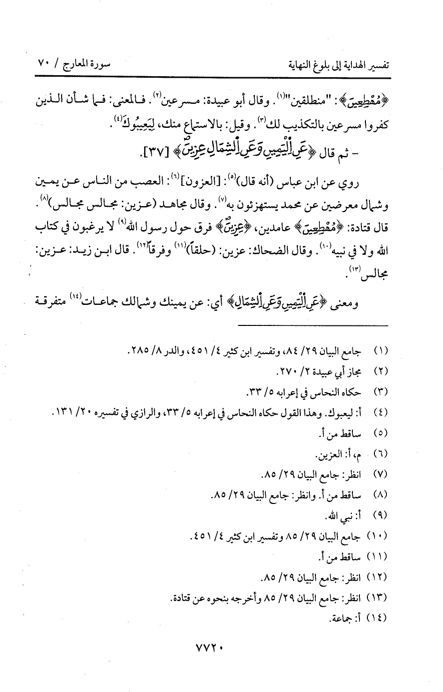 روي عن ابن عباس (أنه قال): [العزون]: العصب من الناس عن يمين وشمال معرضين عن محمد يستهزئون به. وقال مجاهد (عزين: مجالس مجالس). قل قتادة: {مُهْطِعِينَ} عامدين، {عِزِينَ} فرق حول رسول اله لا يرغبون في كتاب الله ولا في نبيه. وقال الضحاك: عزين: (حلقاً) وفرقاً. قال ابن زيد: عزين: مجالس.