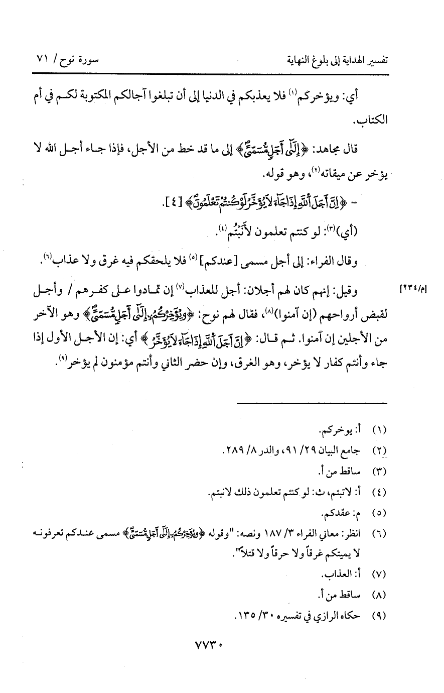 وقال الفراء: إلى أجل مسمى [عندكم] فلا يلحقكم فيه غرق ولا عذاب.