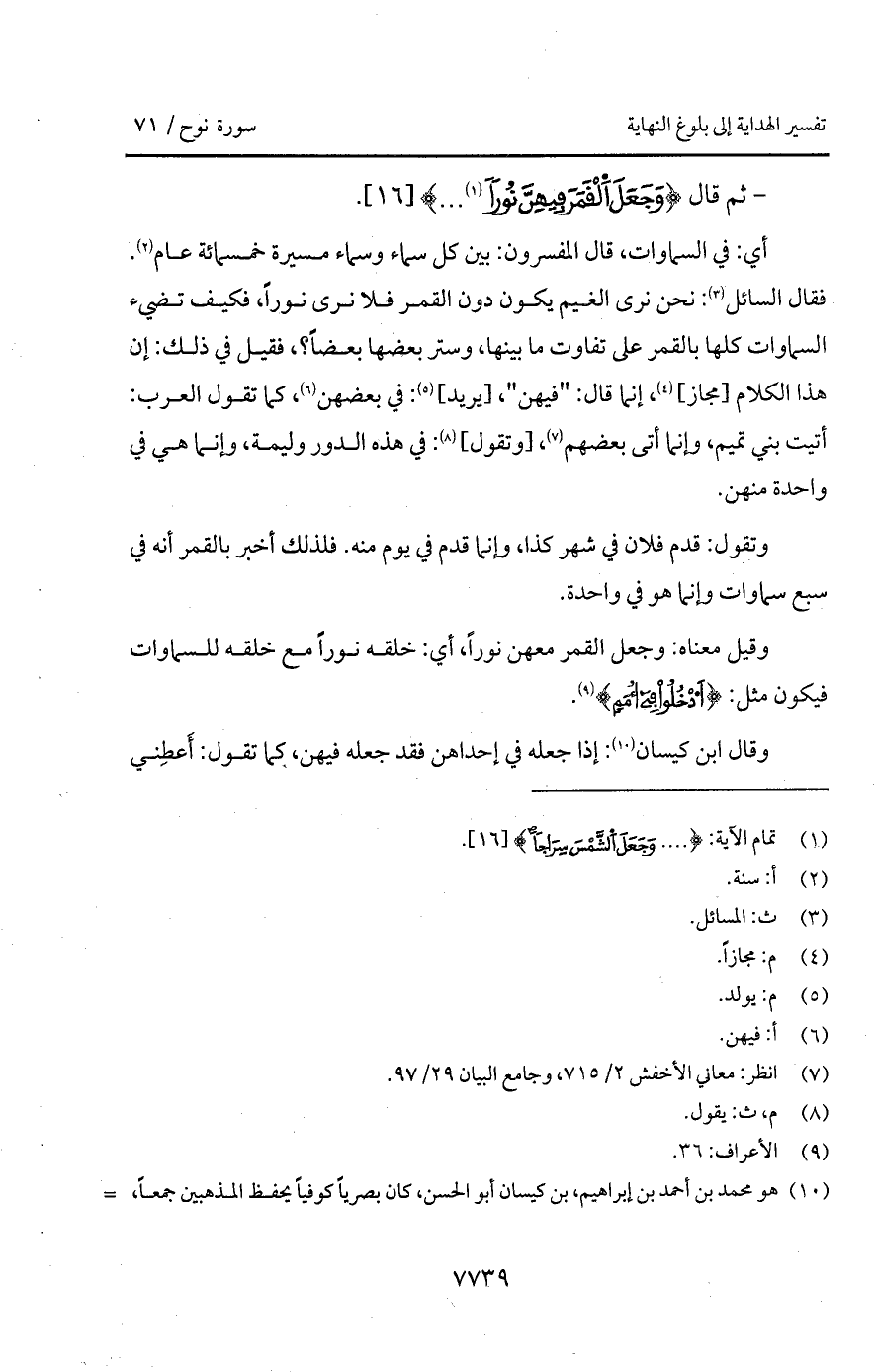 أي: في السماوات، قال المفسرون: بين كل سماء وسماء مسيرة خمسمائة عام. فقال السائل: نحن نرى الغيم يكون دون القمر فلا نرى نوراً، فكيف تضيء السماوات كلها بالقمر على تفاوت ما بينها، وستر بعضها بعضاً؟، فقيل في ذلك: إن هذا الكلام [مجاز]، إنما قال: " فيهن "، [يريد]: في بعضهن، كما تقول العرب: أتيت بن يميم، وإنما أتى بعضهم، [وتقول]: في هذه الدور وليمة، وإنما هي في واحدة منهن.