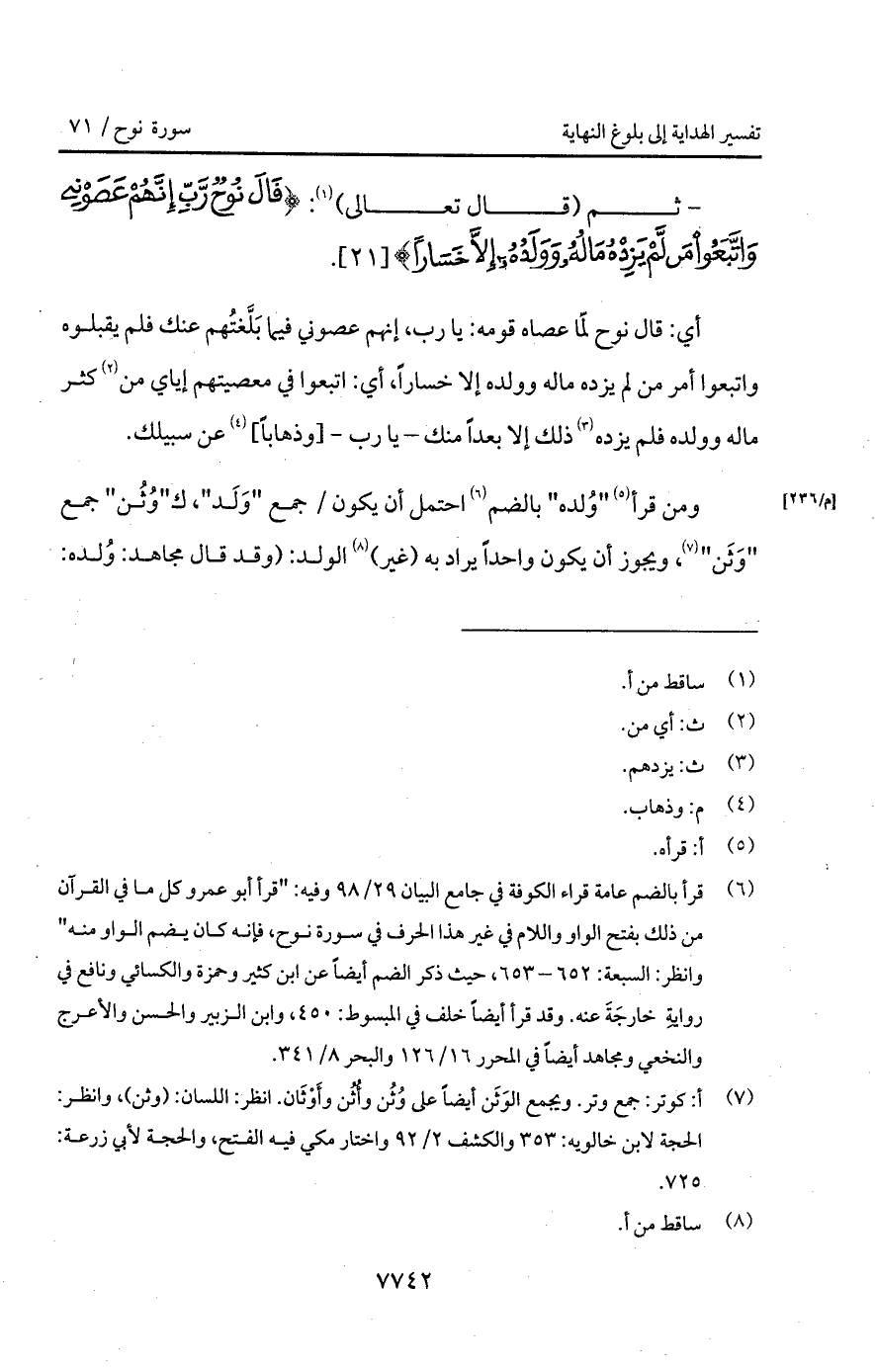 - ثم (قال تعالى): {قَالَ نُوحٌ رَّبِّ إِنَّهُمْ عَصَوْنِي واتبعوا مَن لَّمْ يَزِدْهُ مَالُهُ وَوَلَدُهُ إِلاَّ خَسَاراً}.