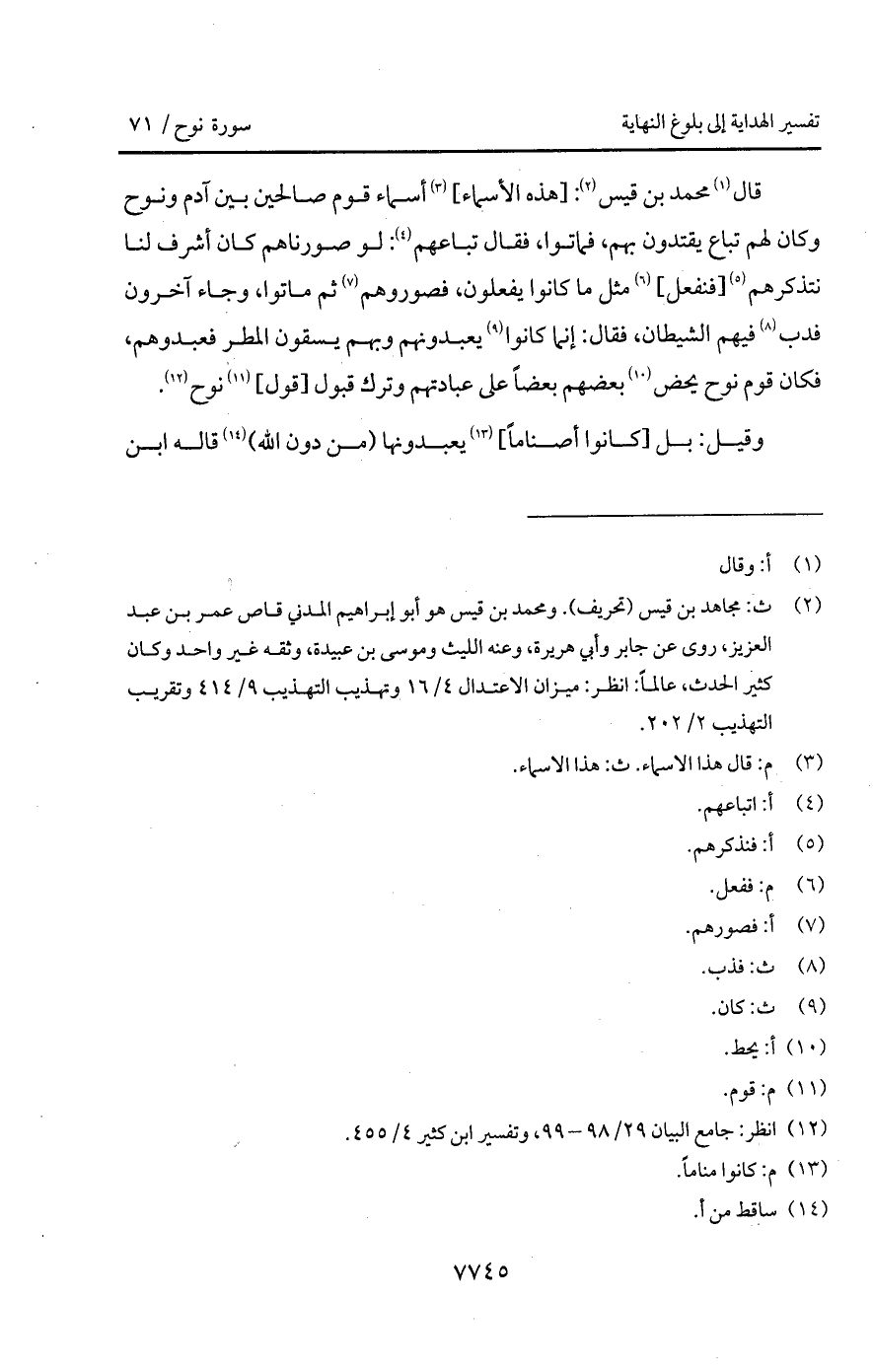 قال محمد بن قيس: [هذه الأسماء] أسماء قوم صالحين بين آدم ونوح وكان لهم تباع يقتدون بهم، فماتوا، فقال تباعهم: لو صورناهم كان أشرف لنا نتذكرهم [فنفعل] مثل ما كانوا يفعلون، فصوروهم ثم ماتوا، وجاء آخرون فدب فيهم الشيطان، فقال: إنما كانوا يعبدونهم وبهم يسقون المطر فعبدوهم، فكان قوم نوح يحض بعضهم بعضاً على عبادتهم وترك قبول [قول] نوح.
