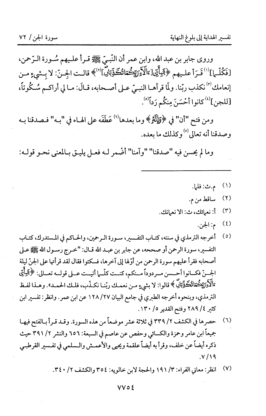 وروى جابر بن عبد الله، وابن عمر " أن النّبيّ A قرأ عليهم سُورة الرّحمن، [فَكُلّما] قَرَأ عليهم {فَبِأَيِّ [آلاء رَبِّكُمَا تُكَذِّبَانِ]} قالت الجِنّ: لا بِشيءٍ من إنعامك نكذب ربّنا. ولمّا قرأها النبيّ على أصحابه، قالَ: ما لي أراكم سُكُوتاً، [للجن] كانوا أحْسَنَ مِنكُم رَدًا ".
