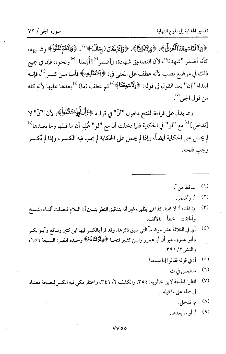 ومما يدل على قراءة الفتح دخول " أنّ " في قوله {وَأَلَّوِ استقاموا}، لأن " أنّ " لا [تدخل] مع " لو " في الحكاية فلما دخلت أن مع " لو " عُلِم أن ما قبلها وما بعدها لم يجعل على الحكاية أيضاً، وإذا لم يحمل على الحكاية لم يجب فيه الكسر، وإذا لم يُكسر وجب فتحه.