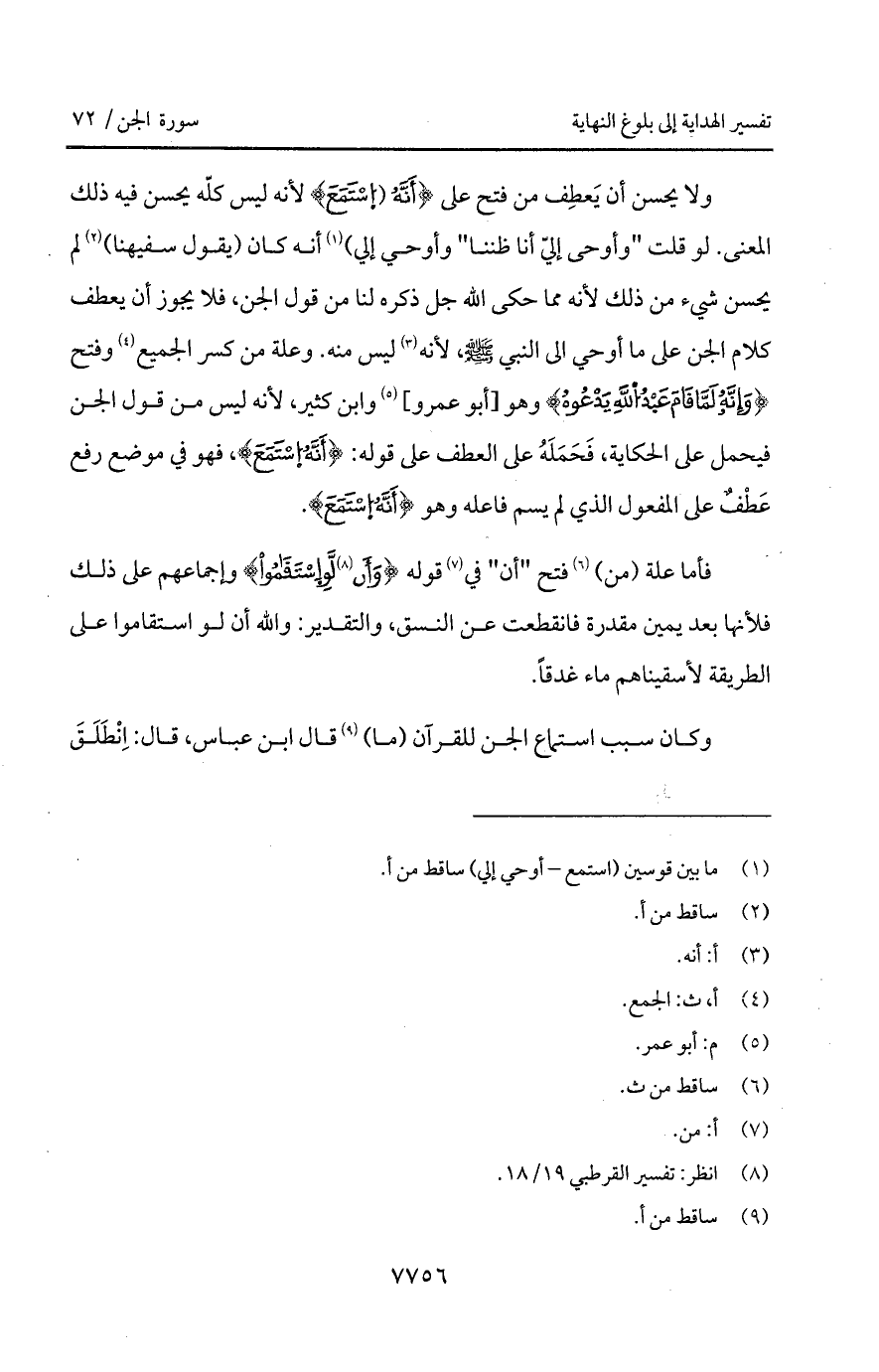 ولا يحسن أن يَعطِف من فتح على {أَنَّهُ (استمع} لأنه ليس كلّه يحسن فيه ذلك المعنى. لو قلت " وأوحى إليّ أنا ظننا " وأوحي إلي) أنه كان (يقول سفيهنا) لم يحسن شيء من ذلك لأنه مما حكى الله جل ذكره لنا من قول الجن، لا يجوز أن يعطف كلام الجن على ما أوحي إلى النبي A، لأنه لي منه. وعلة من كسر الجميع وفتح {وَأَنَّهُ لَمَّا قَامَ عَبْدُ الله يَدْعُوهُ} وهو [أبو عمرو] وابن كثير، لأ، هـ ليس من قول الجن فيحمل على الحكاية، فَحَمَلَهُ على العطف على قوله: {أَنَّهُ استمع}، فهو في موضع رفع عَطْفٌ على المفعول الذي لم يسم فاعله وهو {أَنَّهُ استمع}.